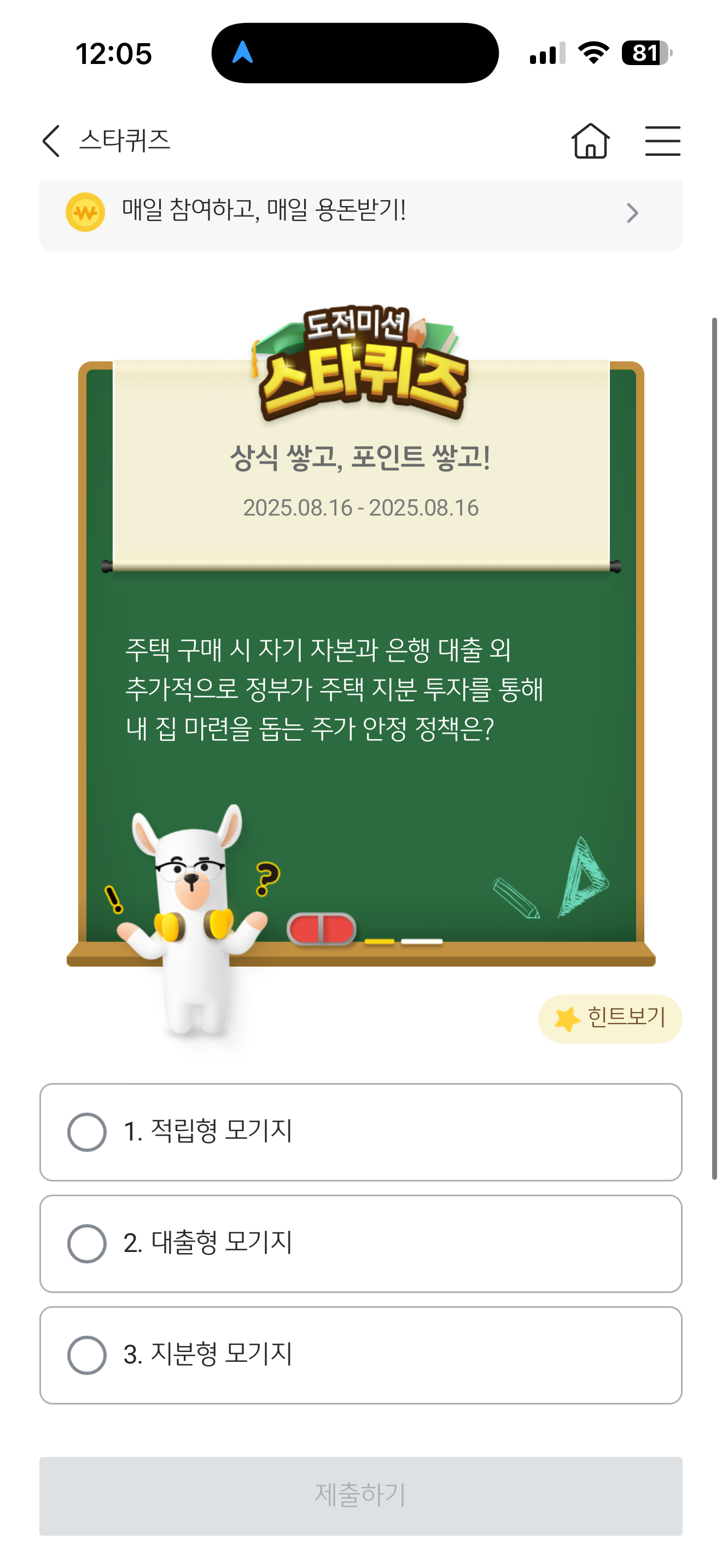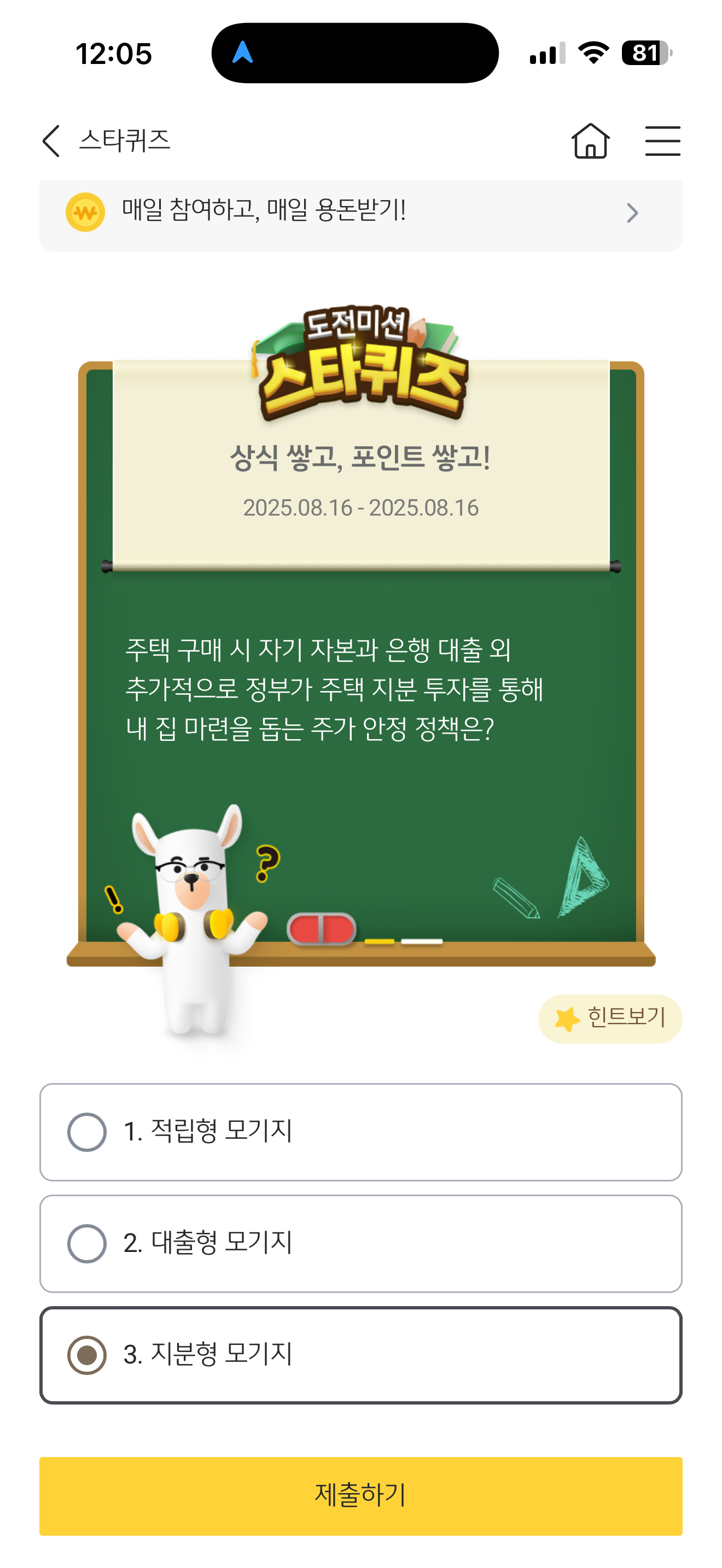 KB스타뱅킹 스타퀴즈 정답은 지분형 모기지 입니다