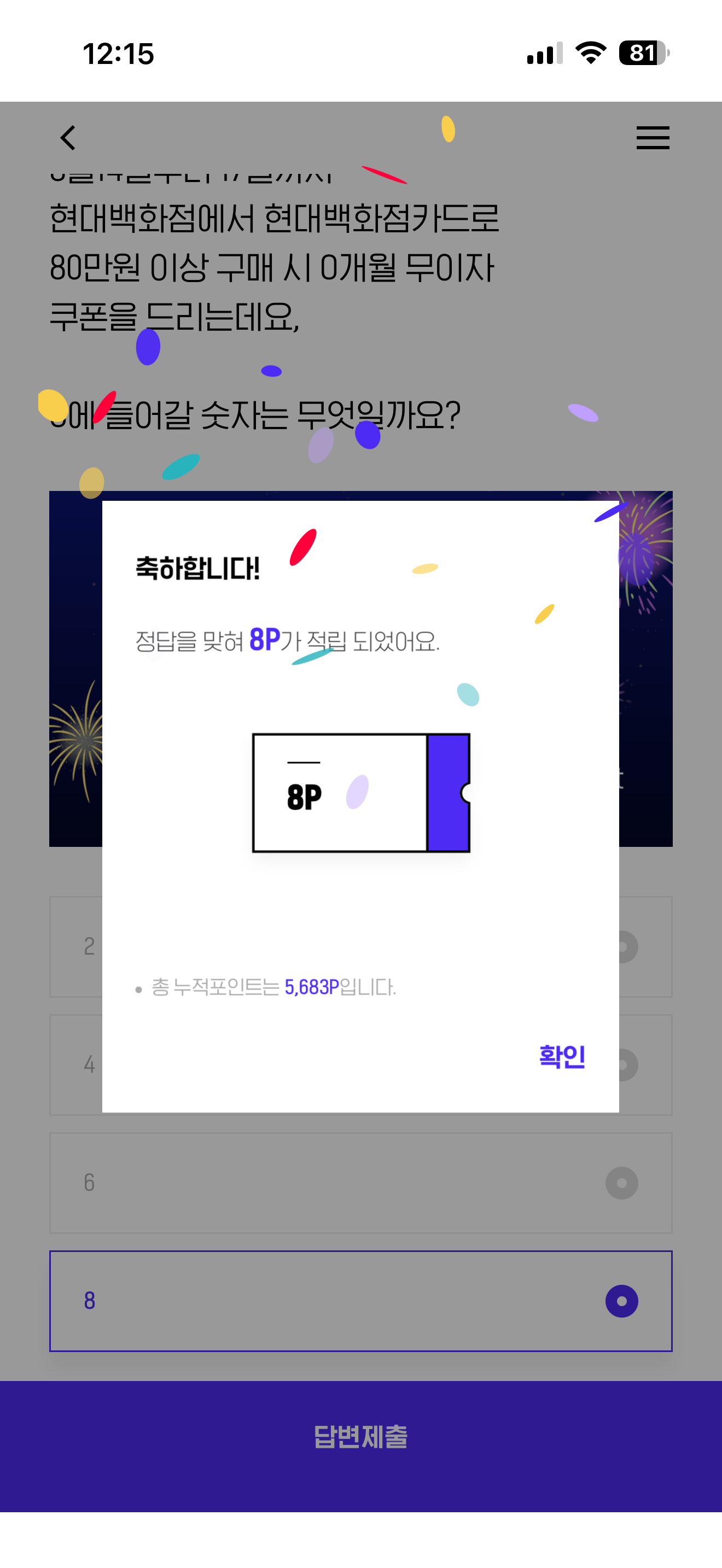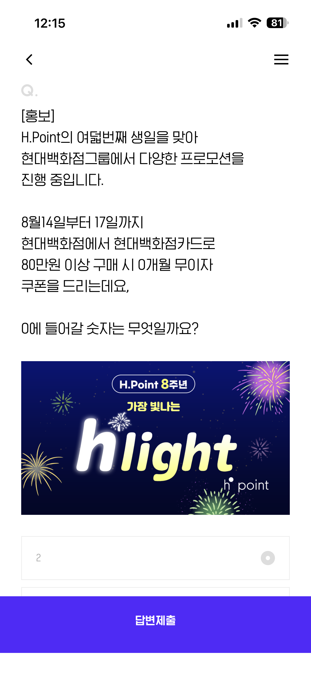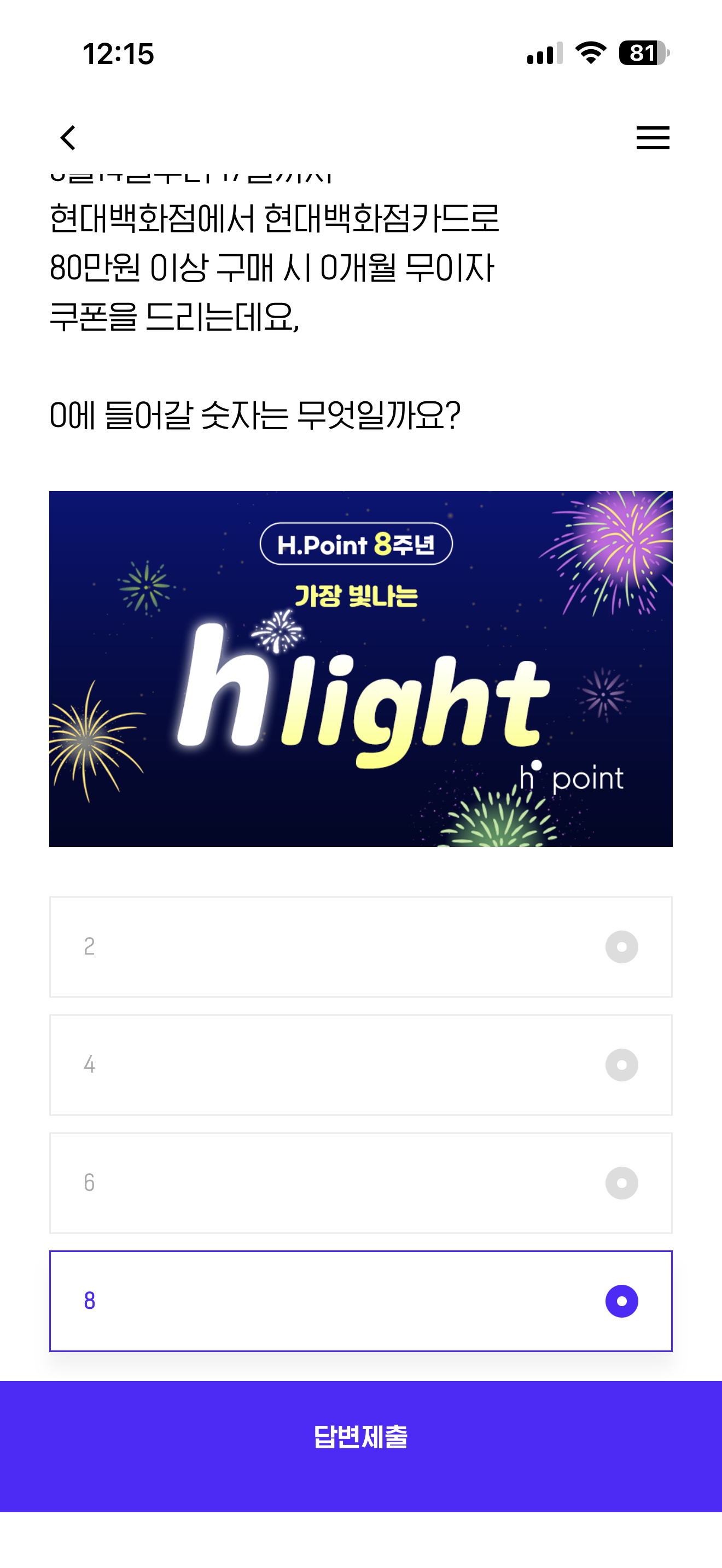 H.Point의 여덟번째 생일을 맞아 현대백화점그룹에서 다양한 프로모션을 진행 중입니다. 8월 14일부터 17일까지 현대백화점에서 현대백화점카드로 80만원 이상 구매 시 0개월 무이자 쿠폰을 드리는데요 O에 들어갈 숫자는 무엇일까요? 보기는 1. 2 2. 4 3. 6 4.8 입니다