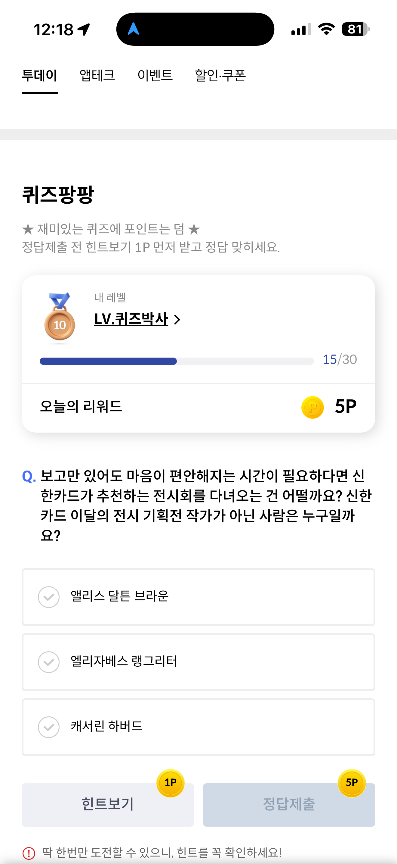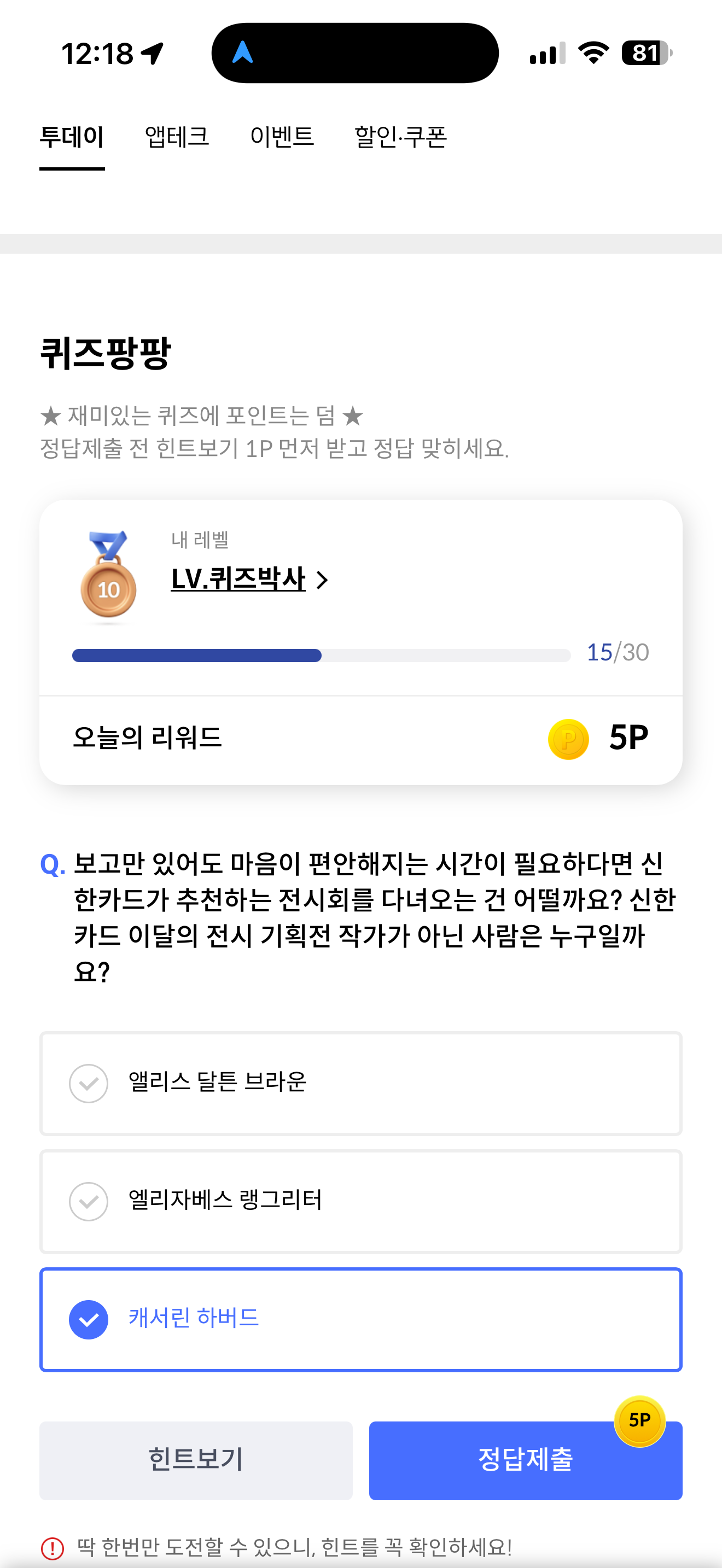 신한카드 퀴즈팡팡 8월 16일 문제입니다