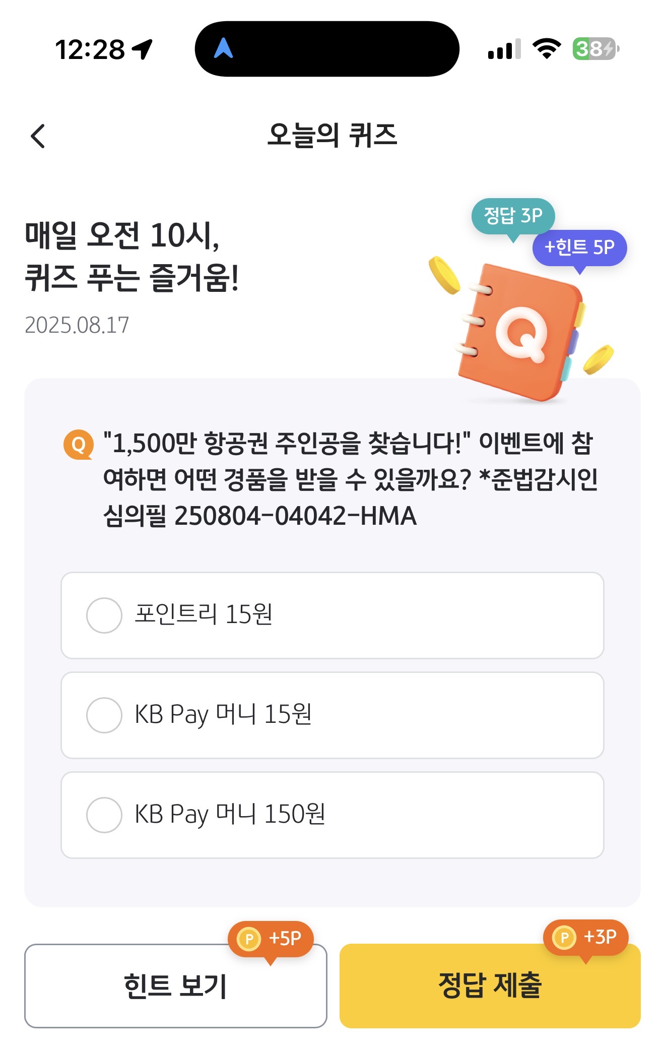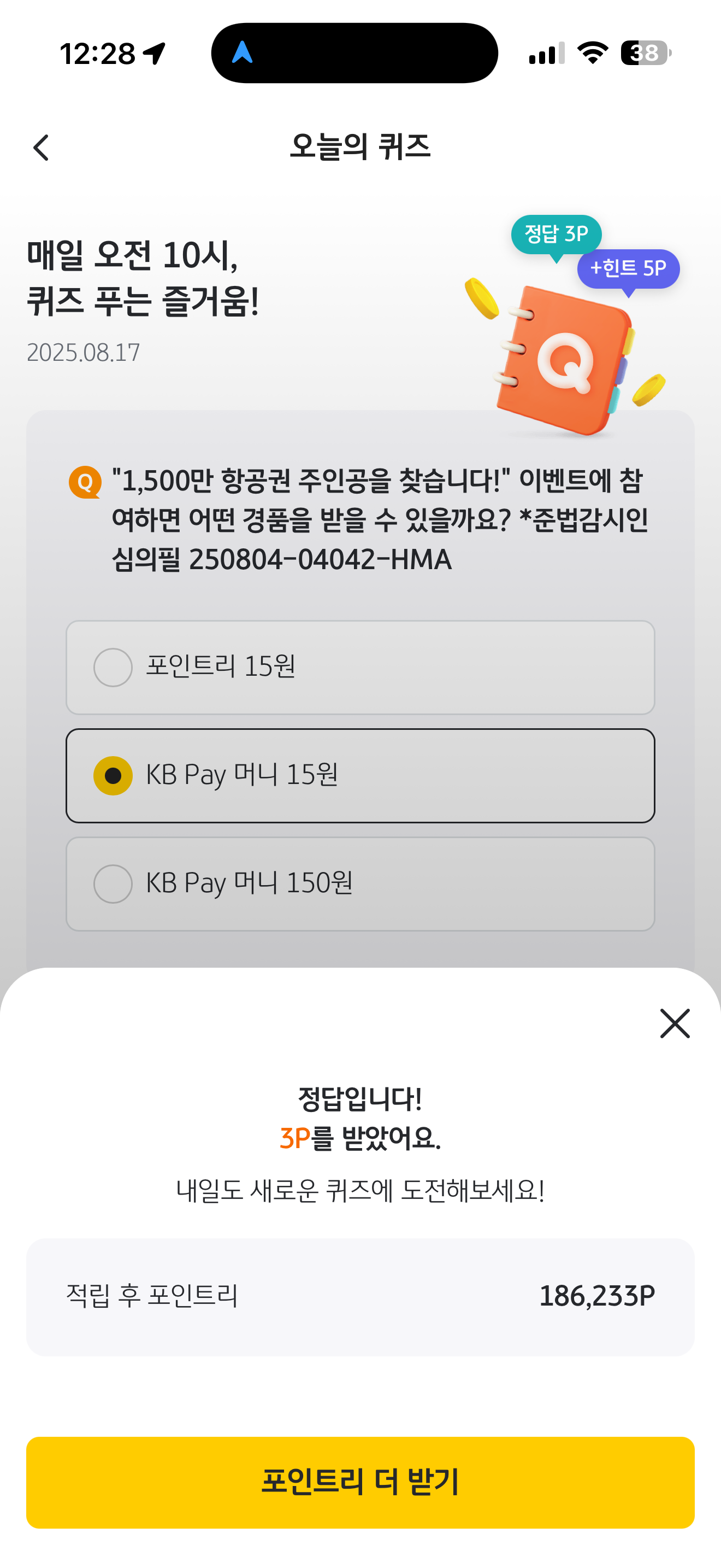 KB Pay 오늘의 퀴즈 정답은 KB Pay 머니 15원 입니다