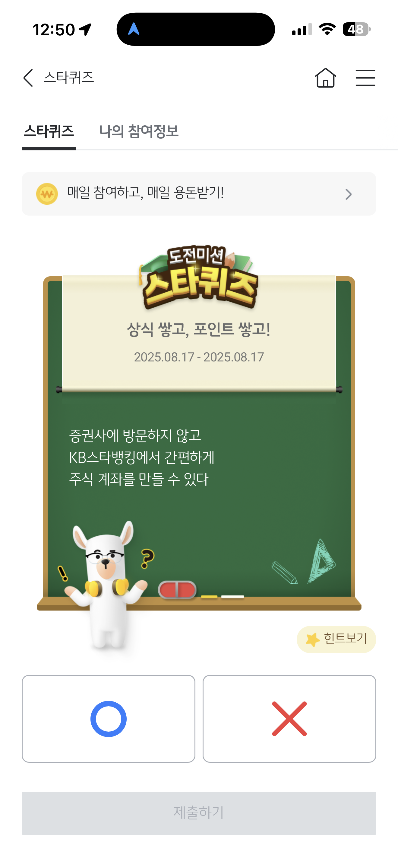 KB스타뱅킹 스타퀴즈 8월 17일 정답(증권사에 방문하지 않고 KB스타뱅킹에서 간편하게 주식 계좌를 만들 수 있다)