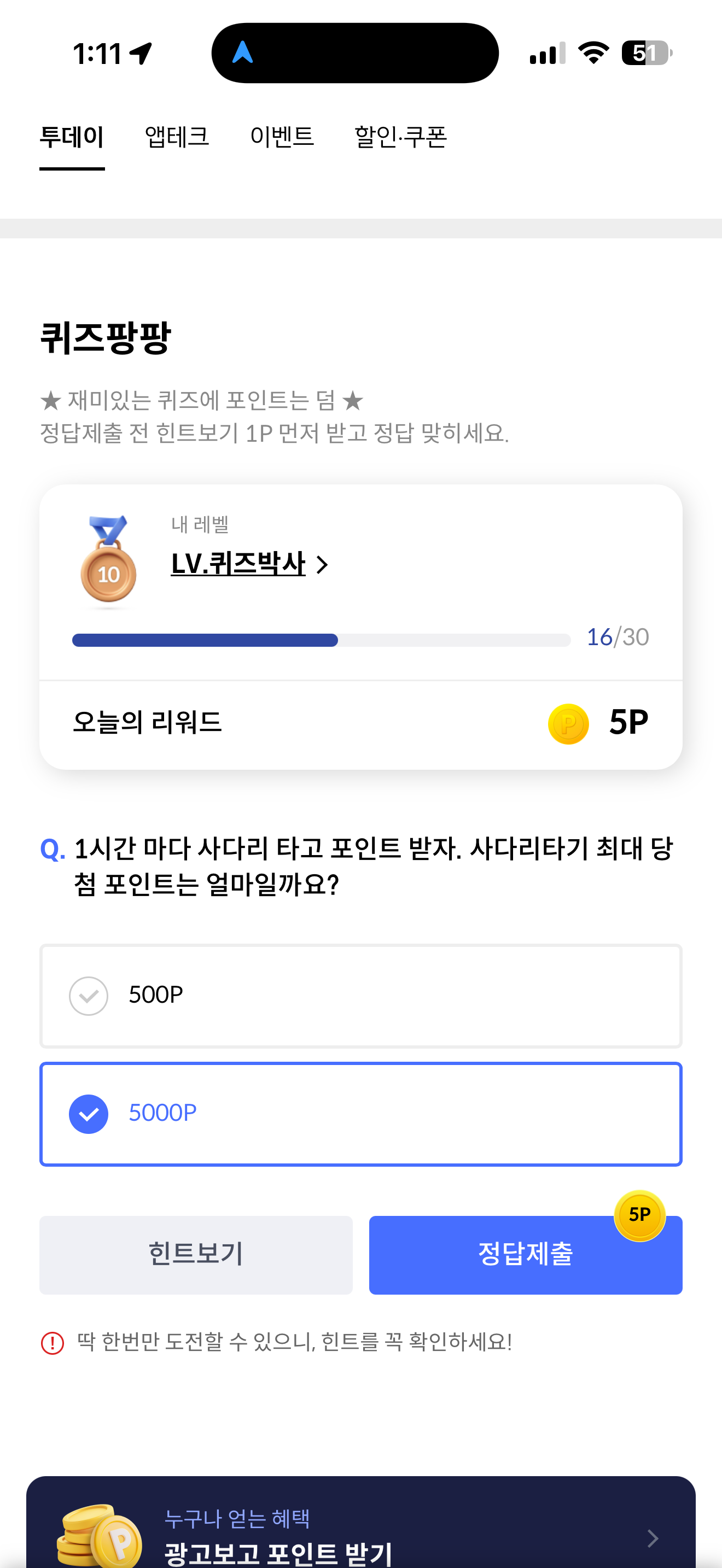 1시간 마다 사다리 타고 포인트 받자. 사다리타기 최대 당첨 포인트는 얼마일까요? 보기는 1. 500P 2. 5000P 입니다 . 1시간 마다 사다리를 타면 포인트를 받을 수 있습니다. 잘 활용해 보세요