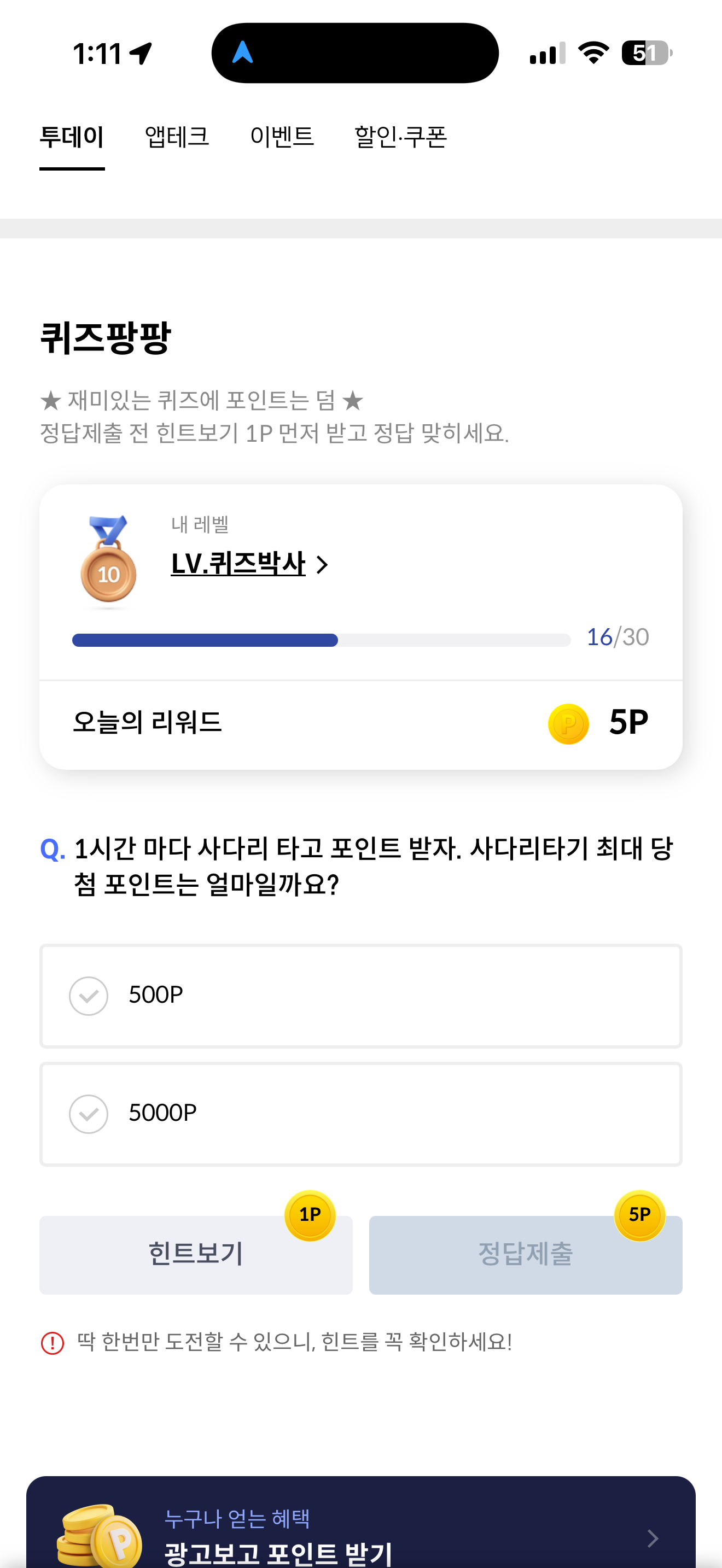 1시간 마다 사다리 타고 포인트 받자. 사다리타기 최대 당첨 포인트는 얼마일까요? 보기는 1. 500P 2. 5000P 입니다 . 1시간 마다 사다리를 타면 포인트를 받을 수 있습니다. 잘 활용해 보세요