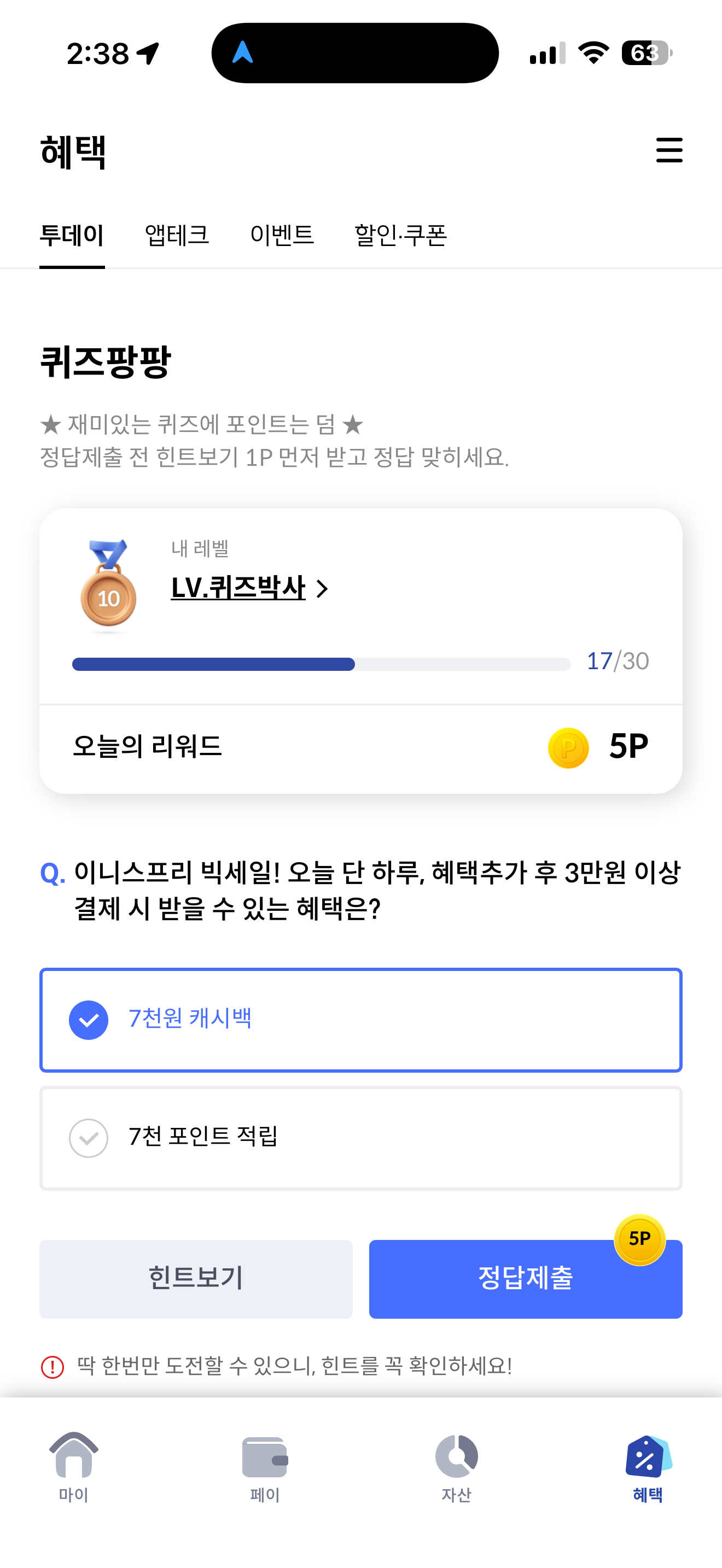 신한카드 퀴즈팡팡 정답은 7천원 캐시백 입니다