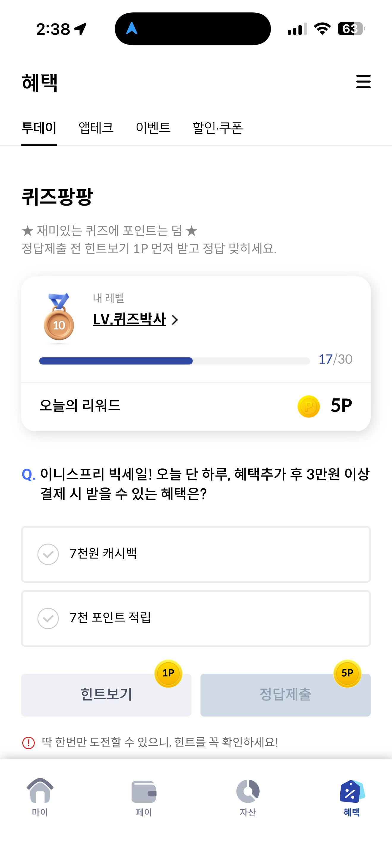 신한카드 퀴즈팡팡 정답은 7천원 캐시백 입니다