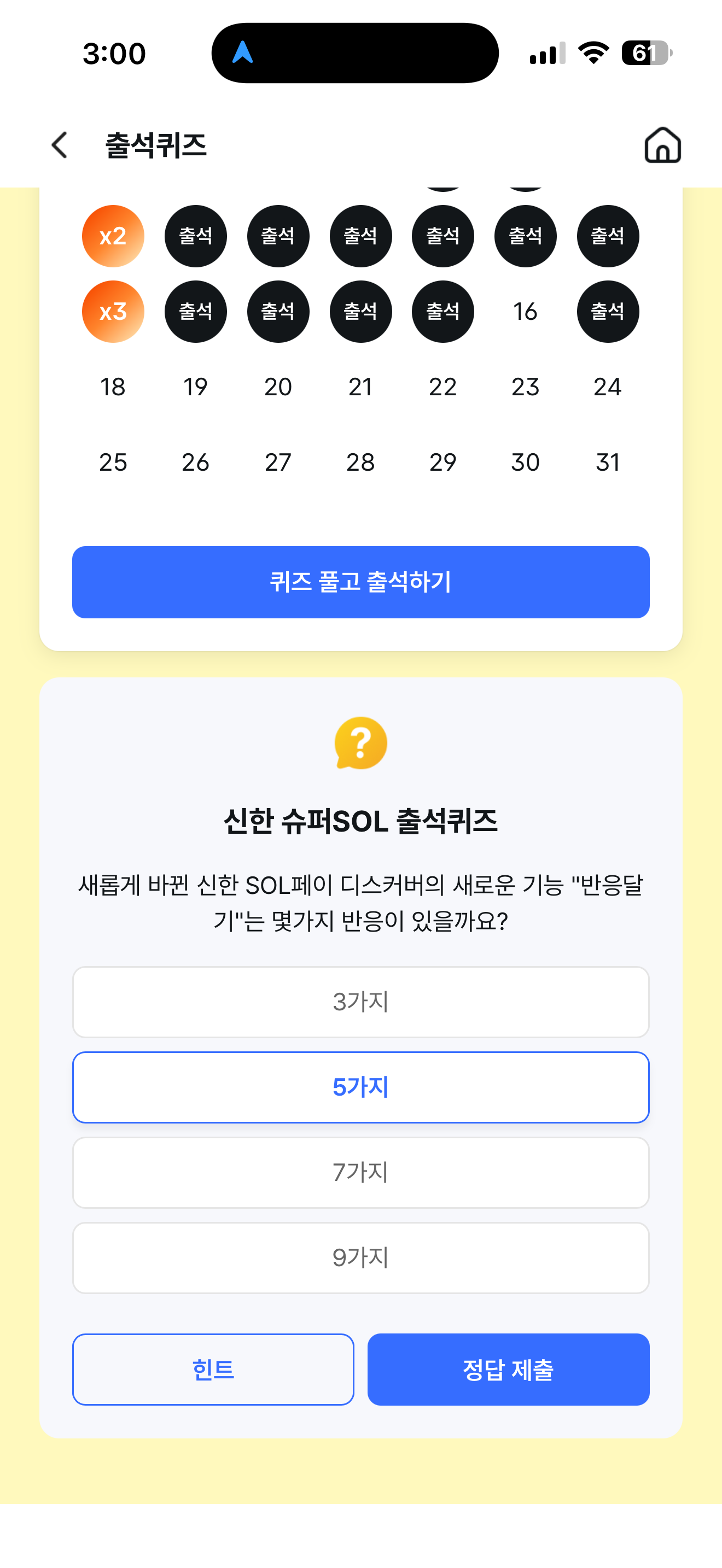 신한 슈퍼SOL 출석퀴즈 8월 18일 정답(새롭게 바뀐 신한 SOL페이 디스커버의 새로운 기능 "반응달기"는 몇가지 반응이 있을까요?)