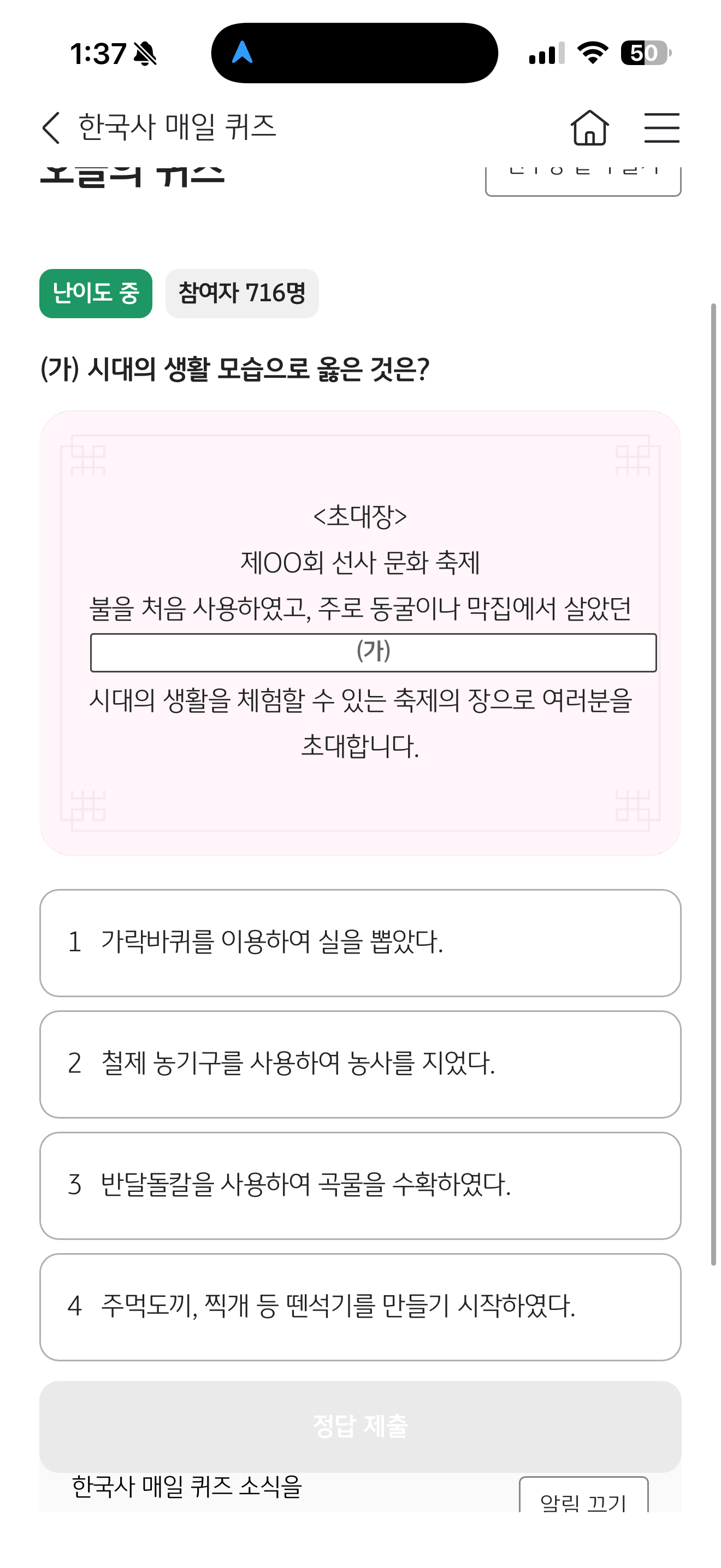 (가) 시대의 생활 모습으로 옳은 것은? <초대장> 제OO회 선사 문화 축제 불을 처음 사용하였고, 주로 동굴이나 막집에서 살았던 (가) 시대의 생활을 체험할 수 있는 축제의 장으로 여러분을 초대합니다. 보기는 1. 가락바퀴를 이용하여 실을 뽑았다 2. 철제 농기구를 사용하여 농사를 지었다 3. 반달돌칼을 사용하여 곡물을 수확하였다 4. 주먹도끼, 찍개 등 뗀석기를 만들기 시작하였다