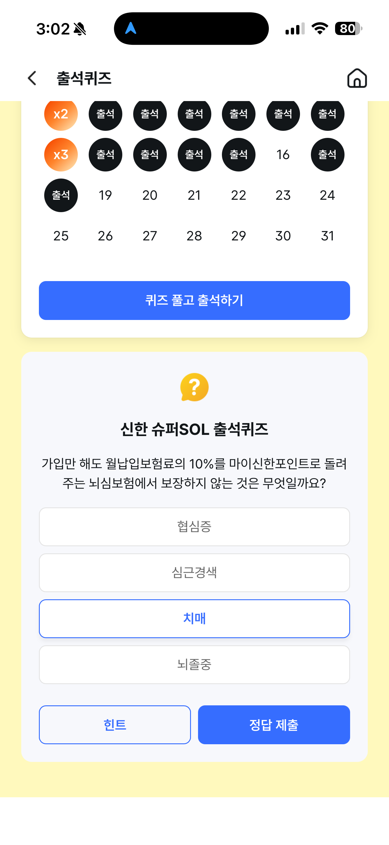 신한 슈퍼SOL 출석퀴즈 정답은 치매 입니다