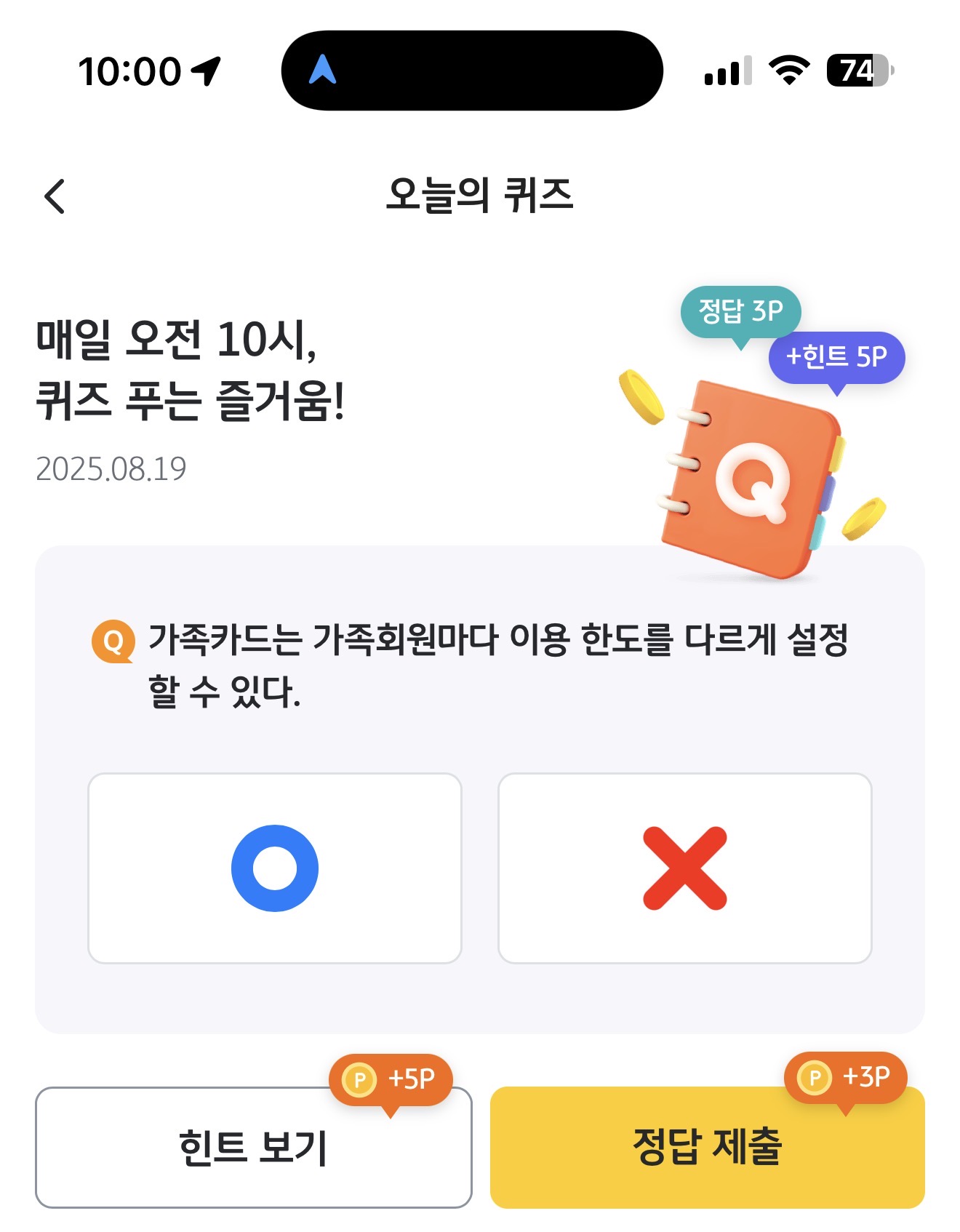 가족카드는 가족회원마다 이용 한도를 다르게 설정 할 수 있다. O, X 퀴즈인데요. 가족카드를 사용할때 통합적으로 결제가 되는데 과연 가족카드마다 한도를 다르게 설정할 수 있을까요? 가족카드 사용하는 분들, 사용하실 분들은 참고해보세요