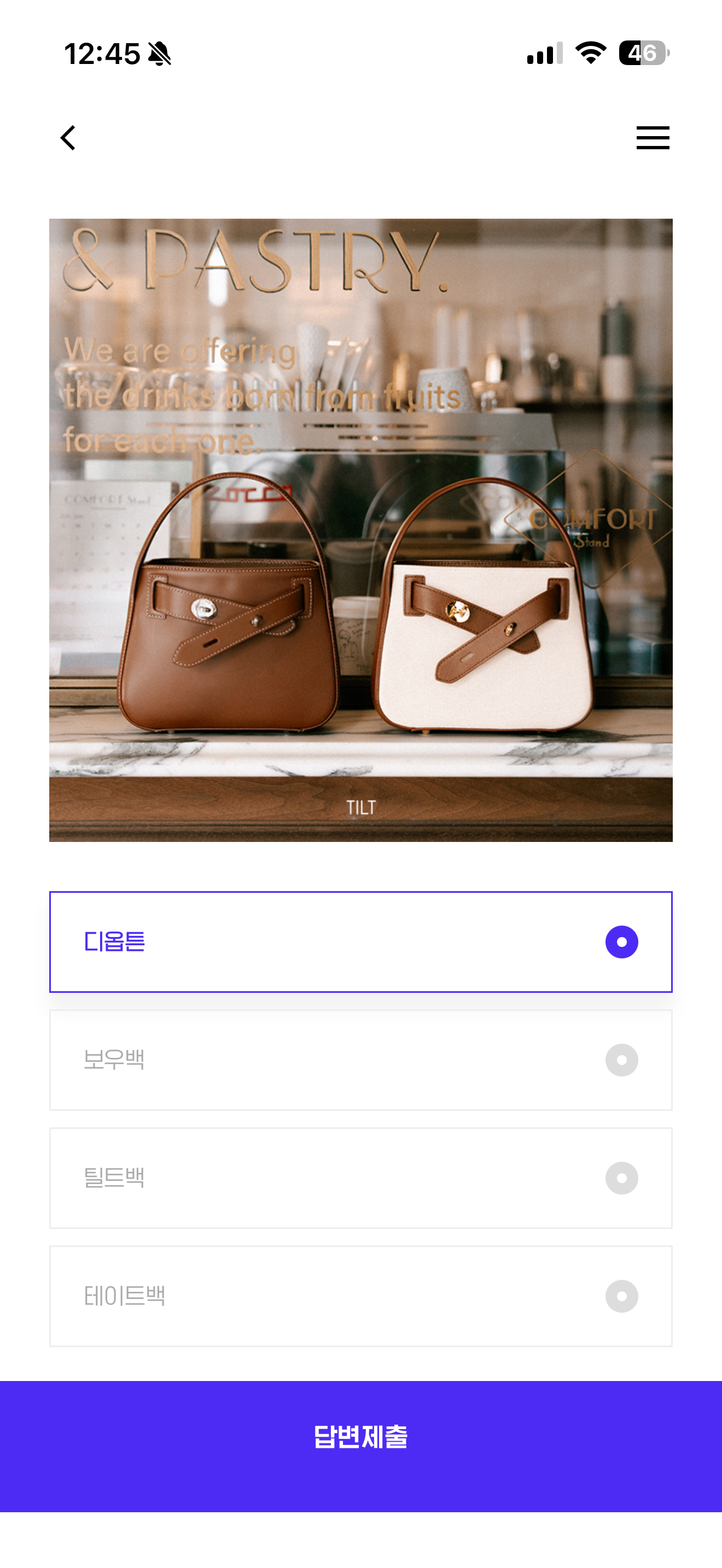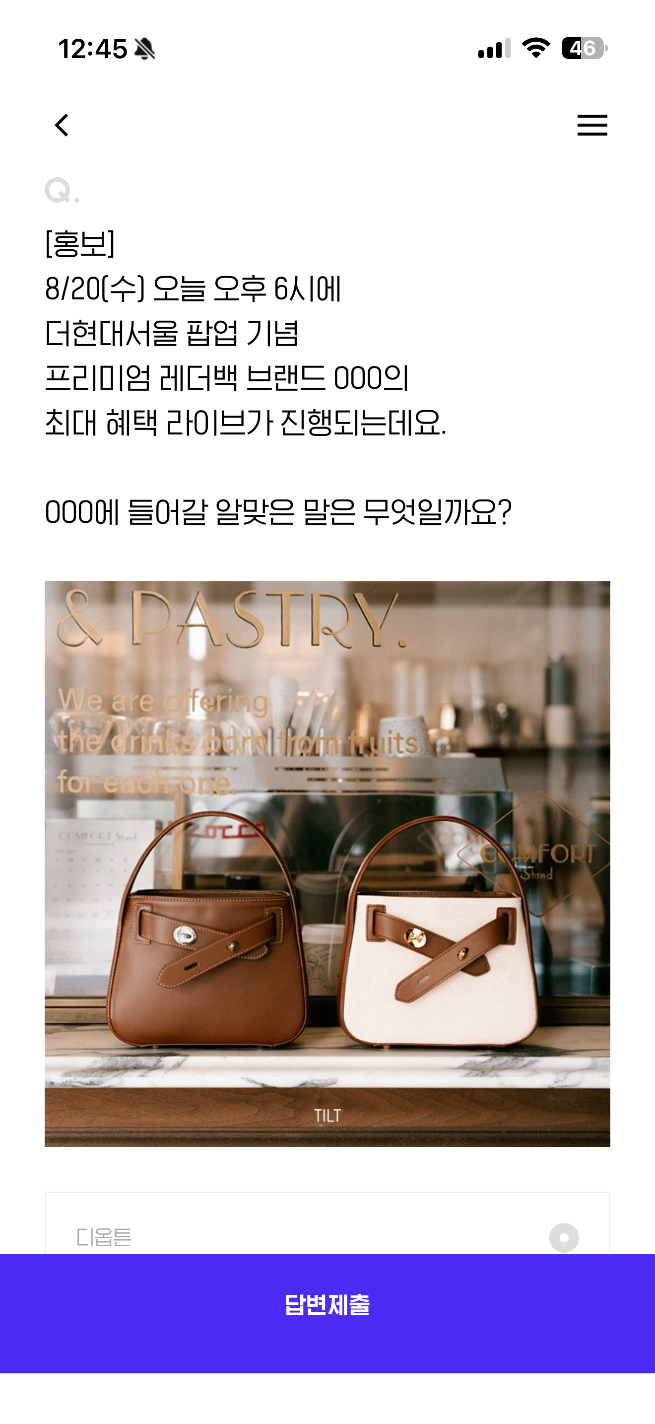 8/20(수) 오늘 오후 6시에 더현대서울 팝업 기념 프리미엄 레더백 브랜드 000의 최애 혜택 라이브가 진행되는데요. 000에 들어갈 알맞은 말은 무엇일까요? 보기는 1. 디옵튼 2. 보우백 3. 틸트백 4. 테이트백 입니다