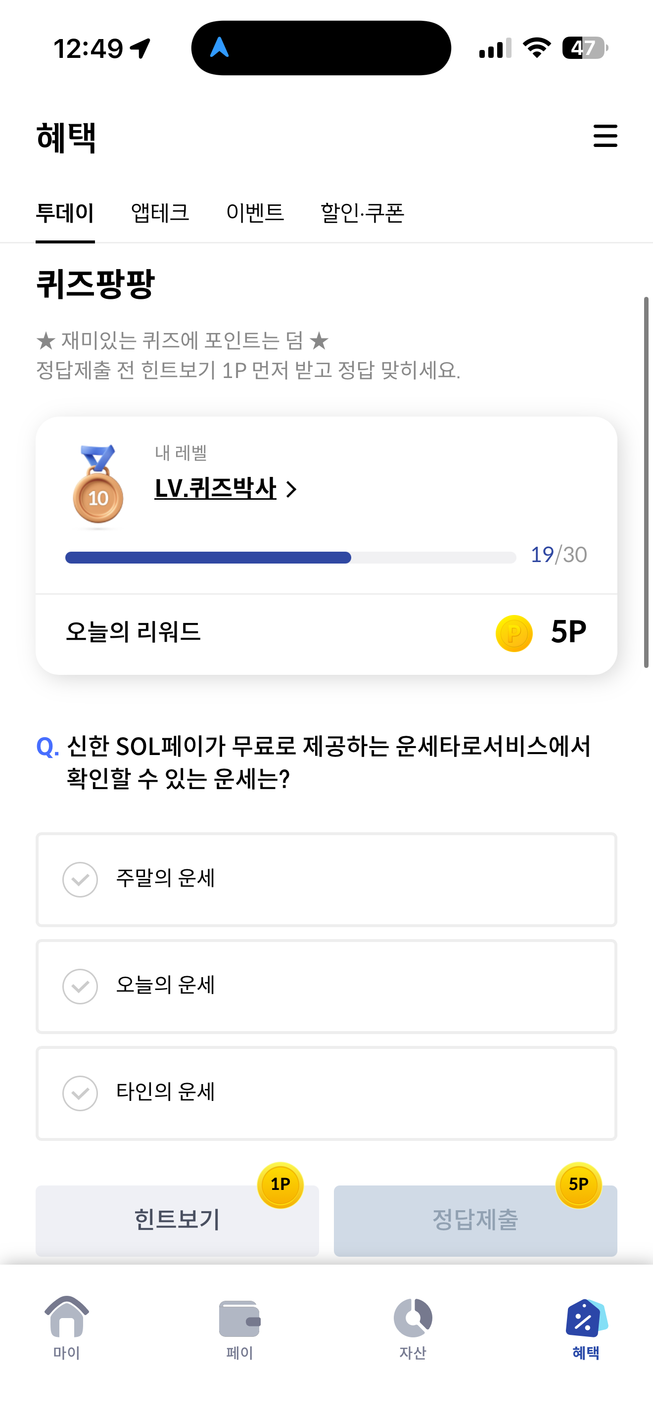 신한카드 퀴즈팡팡 정답은 오늘의 운세 입니다