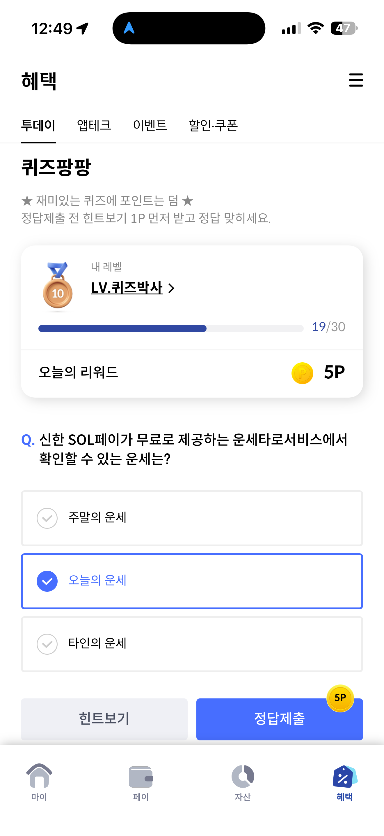 신한카드 퀴즈팡팡 정답은 오늘의 운세 입니다
