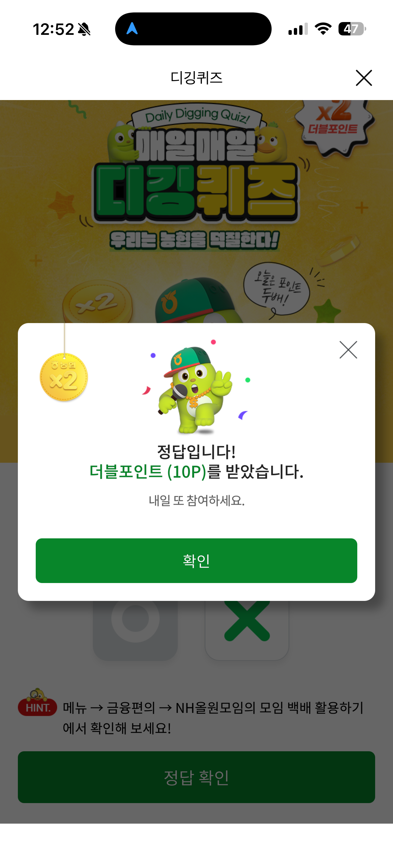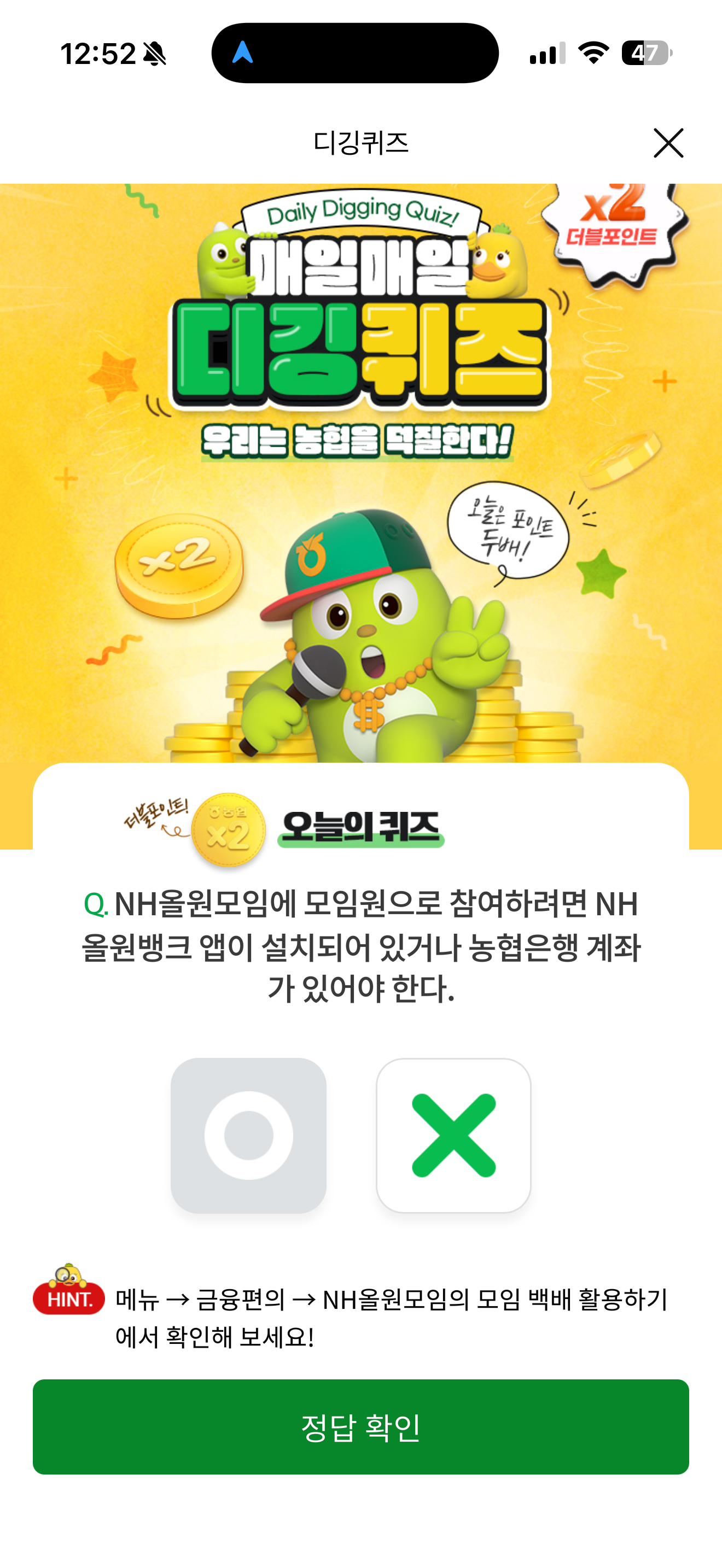 NH올원뱅크 디깅퀴즈 정답은 X 입니다