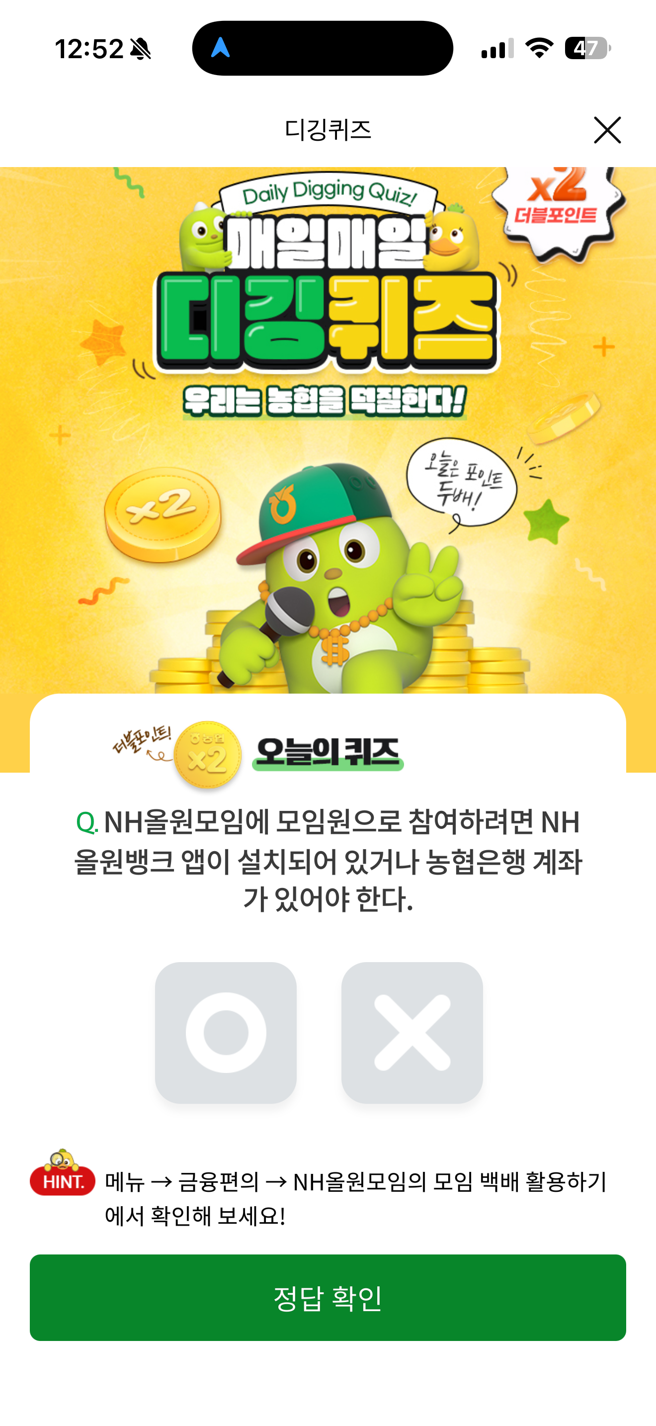 NH올원뱅크 디깅퀴즈 정답은 X 입니다