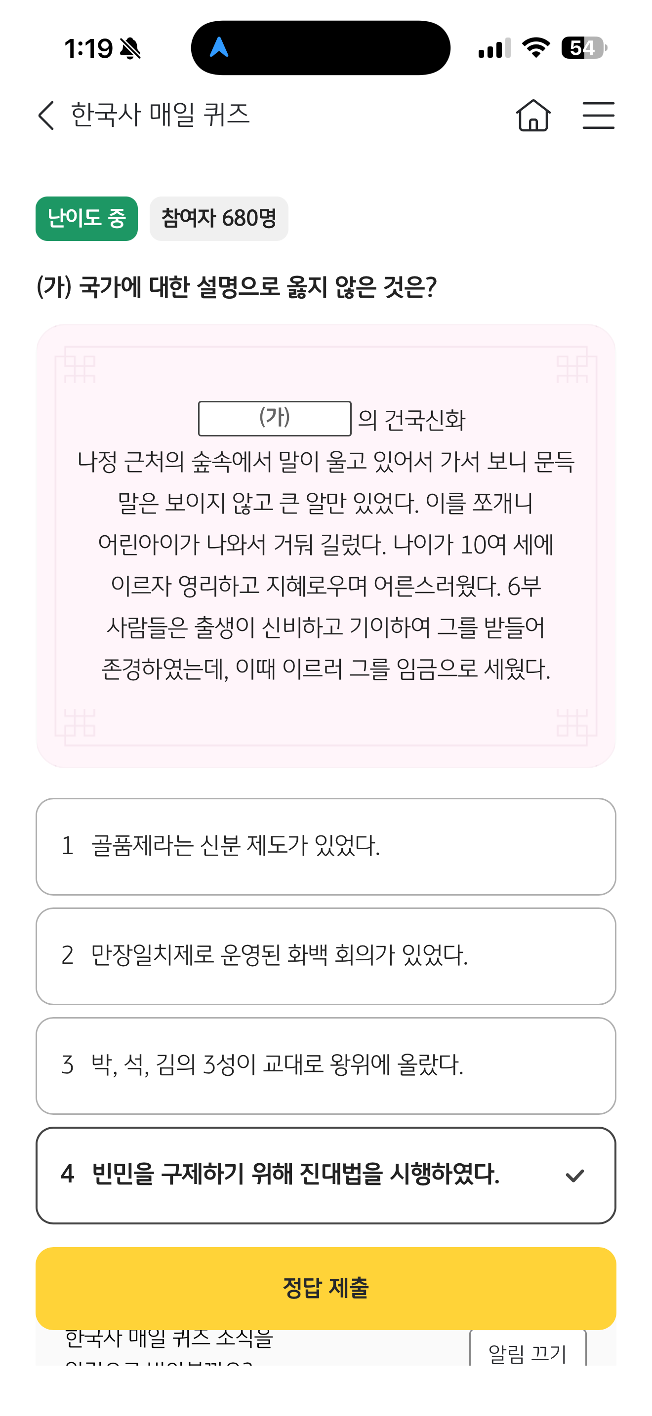 KB스타뱅킹 한국사 매일 퀴즈 정답은 빈민을 구제하기 위해 진대법을 시행하였다 입니다