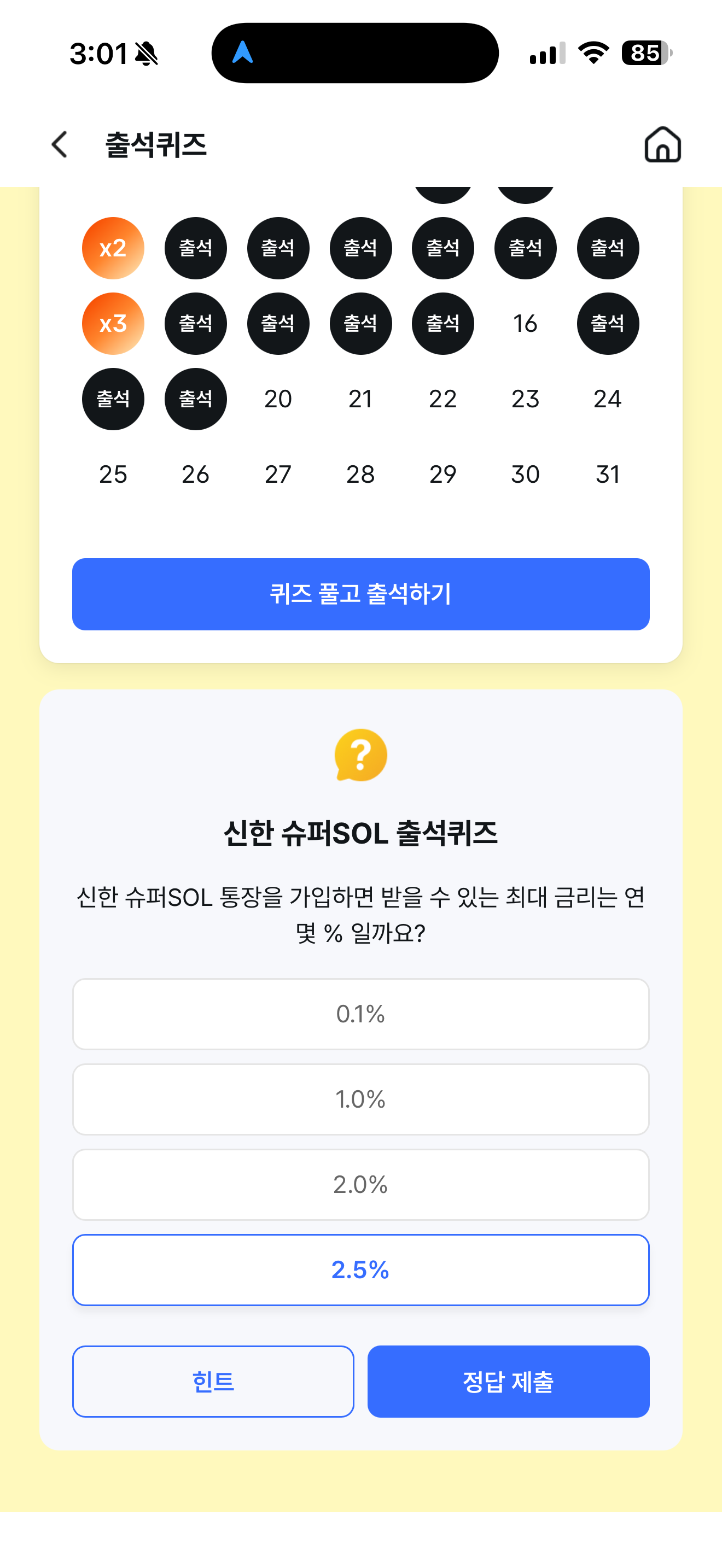 신한 슈퍼SOL 출석퀴즈 정답은 2.5% 입니다