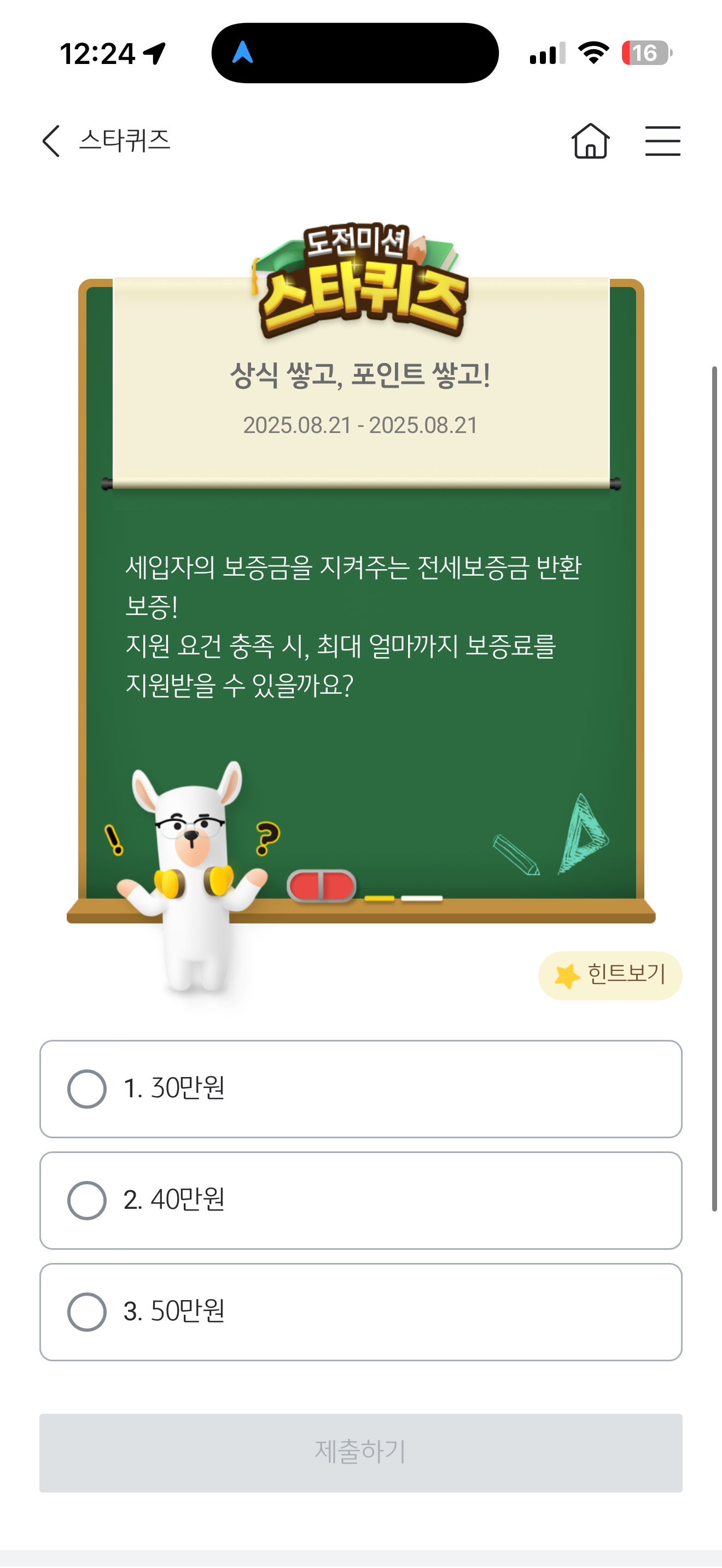 세입자의 보증금을 지켜주는 전세보증금 반환 보증! 지원 요건 충족 시, 최대 얼마까지 보증료를 지원받을 수 있을까요? 보기는 1. 30만원 2. 40만원 3. 50만원 입니다. 전세보증금 반환 보증 굉장히 중요한 서비스인데요. 잘 참고해 두세요