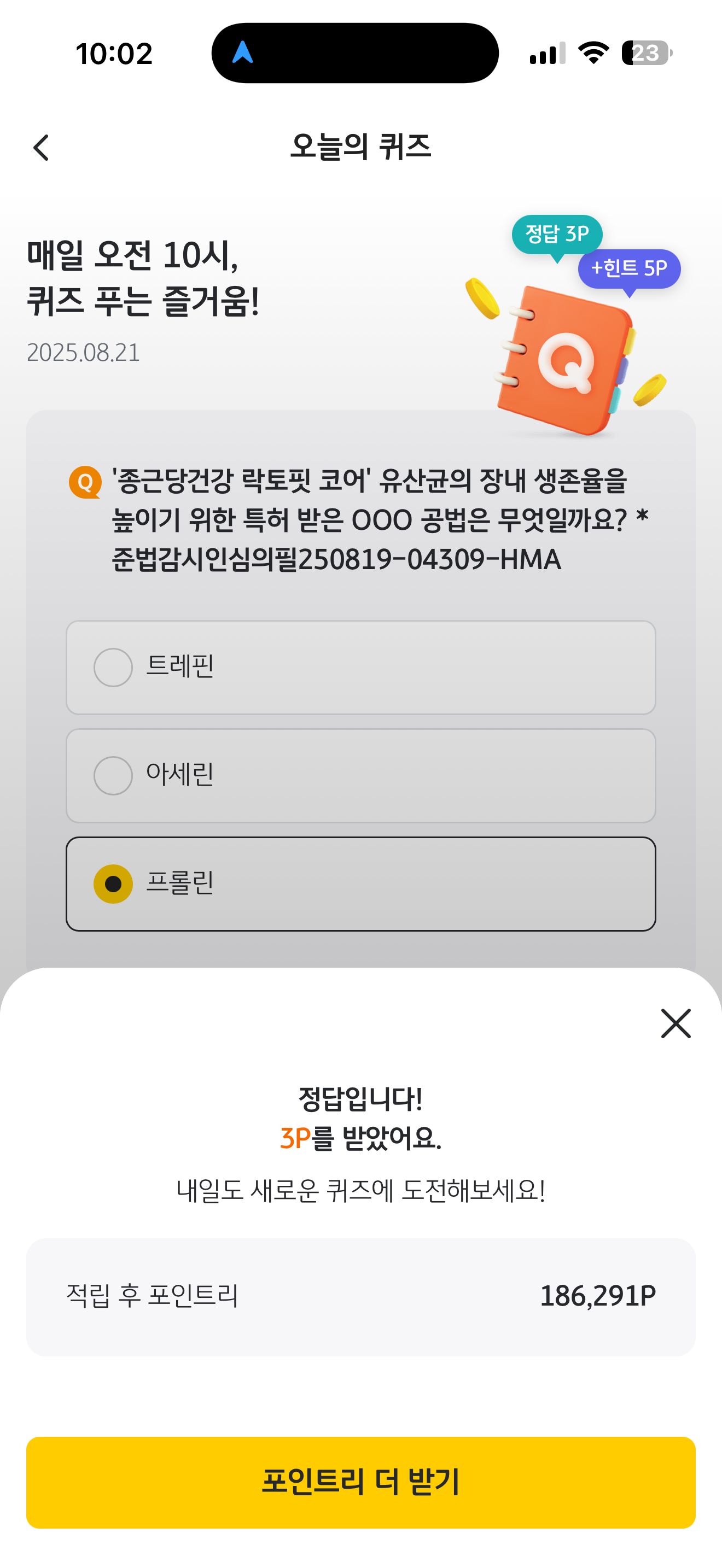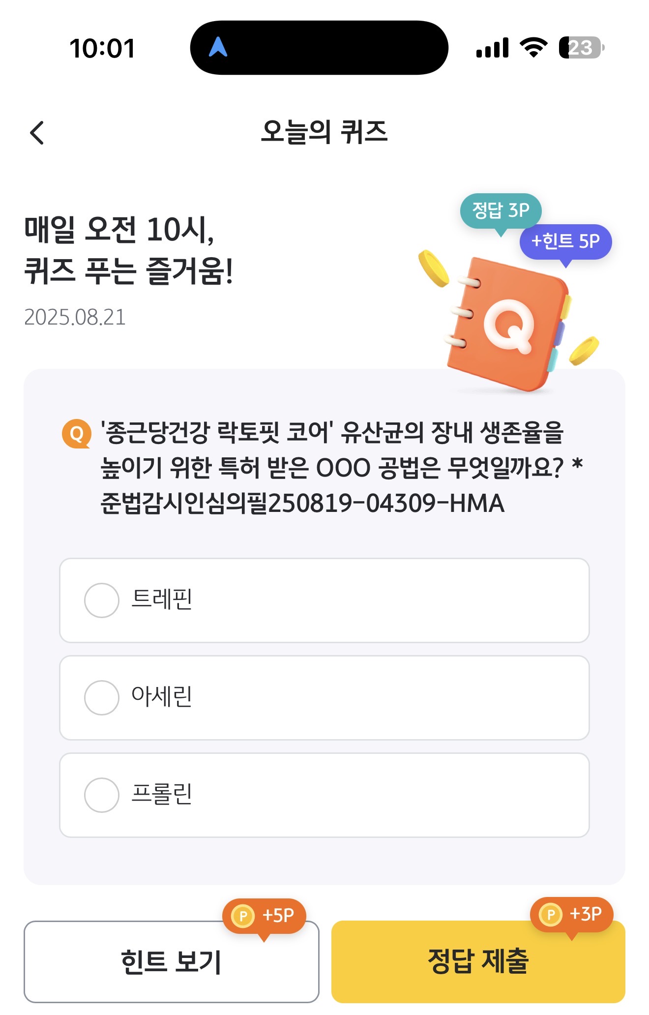 '종근당건강 락토핏 코어' 유산균의 장내 생존율을 높이기 위한 특허 받은 OOO 공법은 무엇일까요? *준법감시인심의필250819-04309-HMA 보기는 1. 트레핀 2. 아세린 3. 프롤린 입니다
