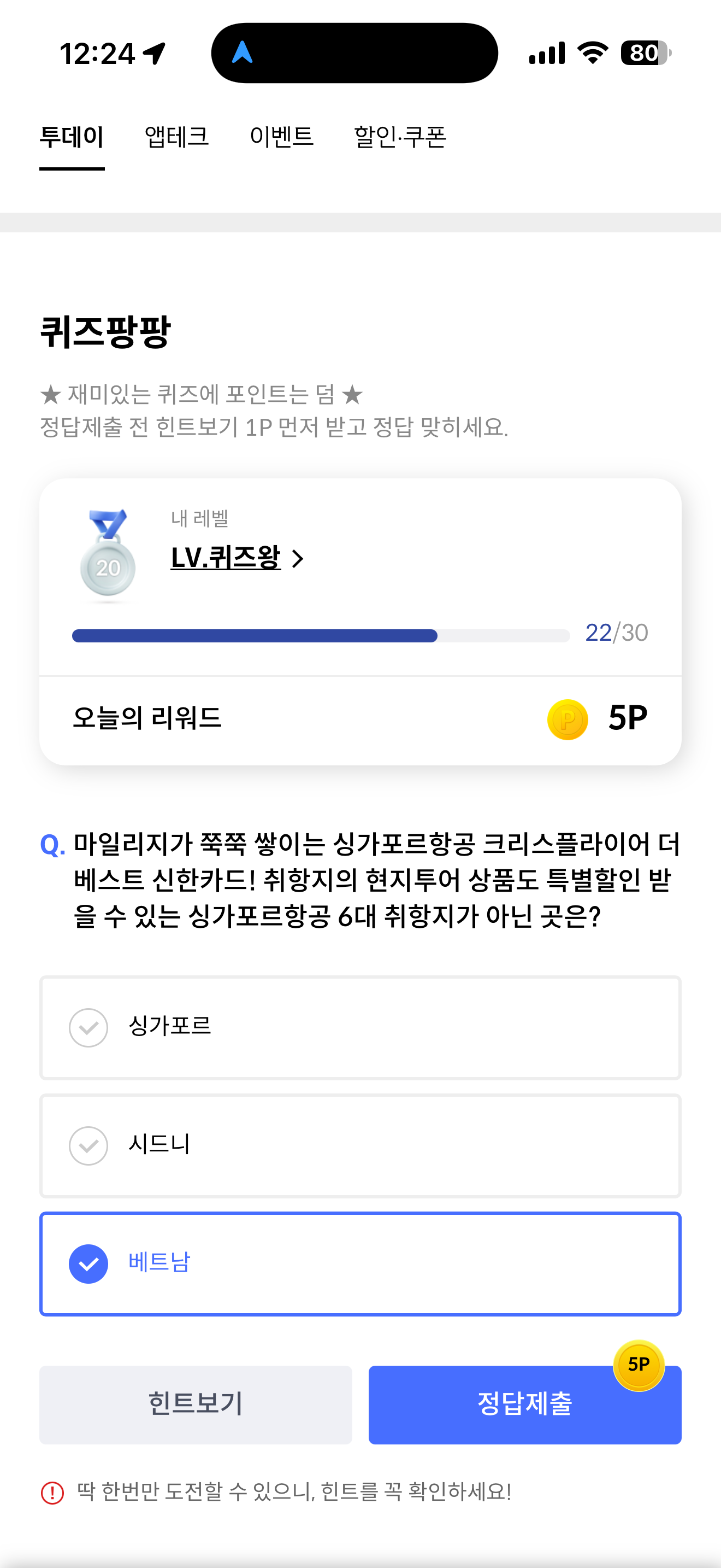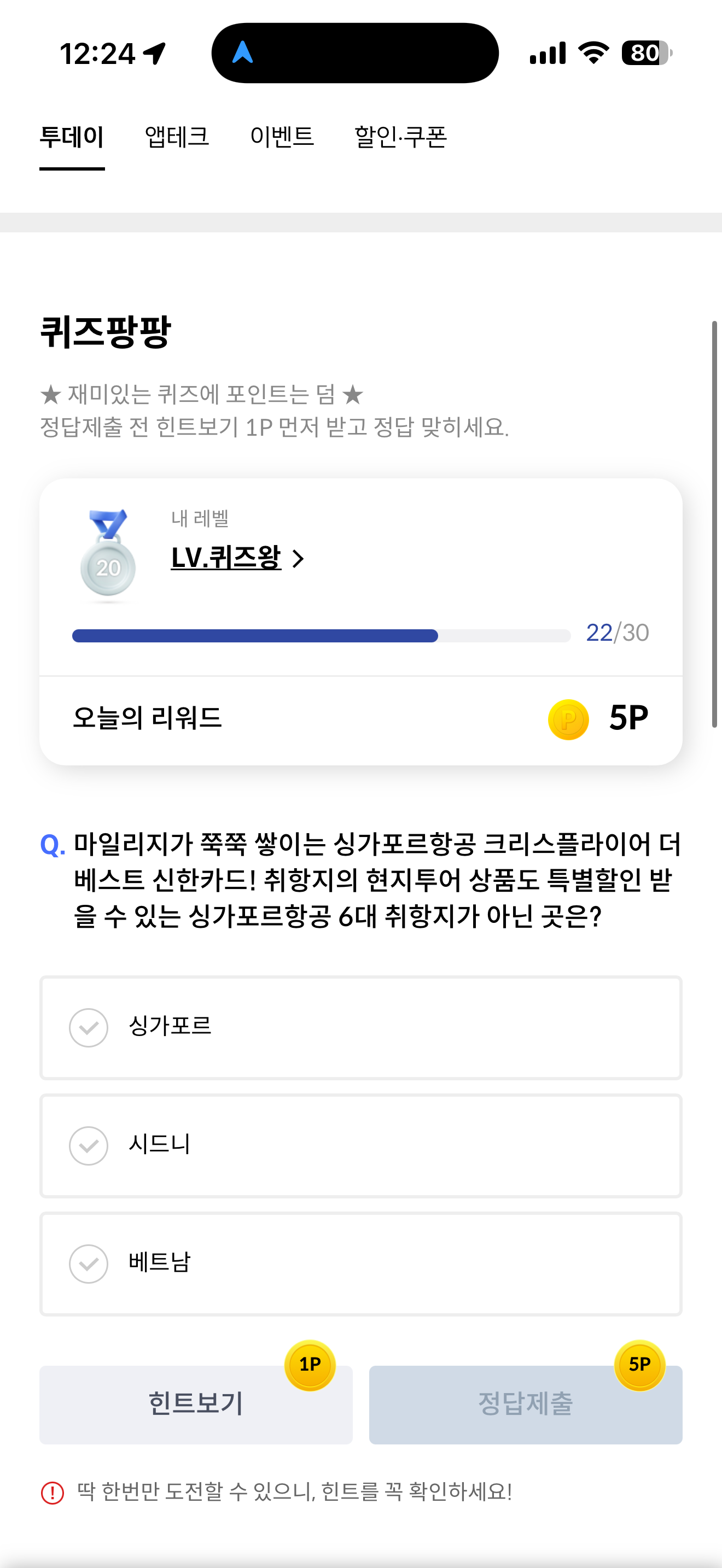마일리지가 쭉쭉 쌓이는 싱가포르항공 크리스플라이어 더베스트 신한카드! 취항지의 현지투어 상품도 특별할인 받을 수 있는 싱가포르항공 6대 취항지가 아닌 곳은? 보기는 1. 싱가포르 2. 시드니 3. 베트남 입니다