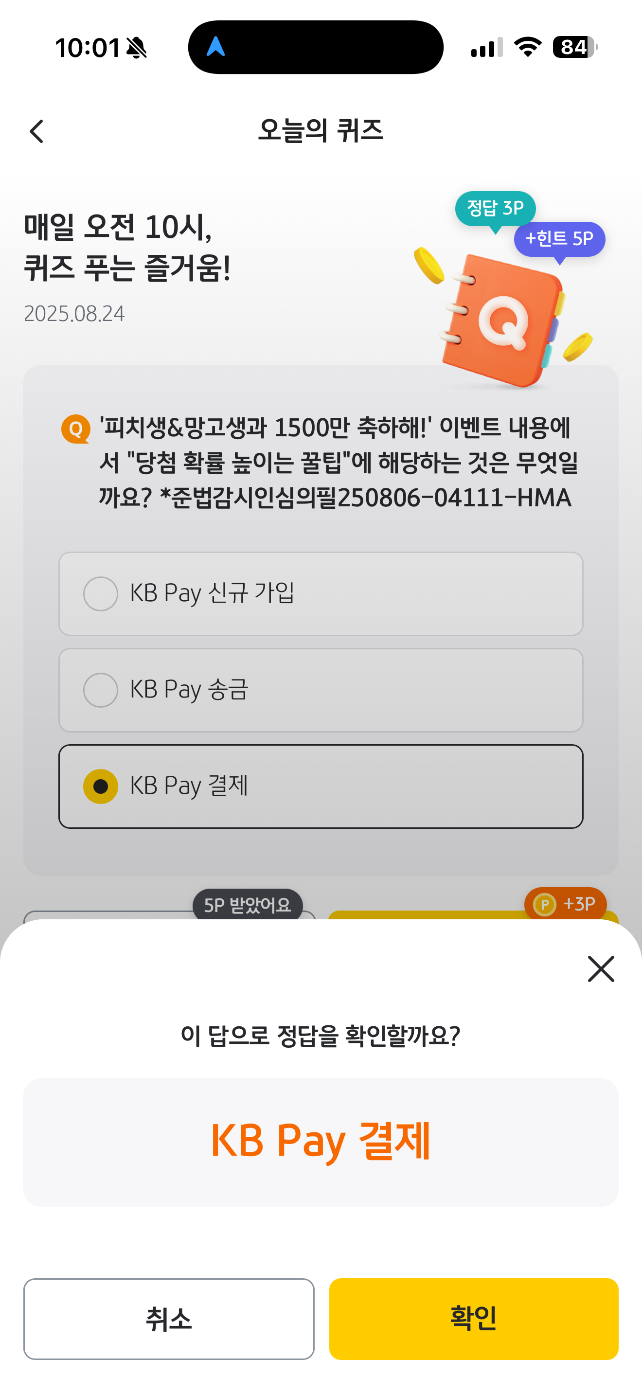 KB Pay 오늘의 퀴즈 정답은 KB Pay 결제 입니다