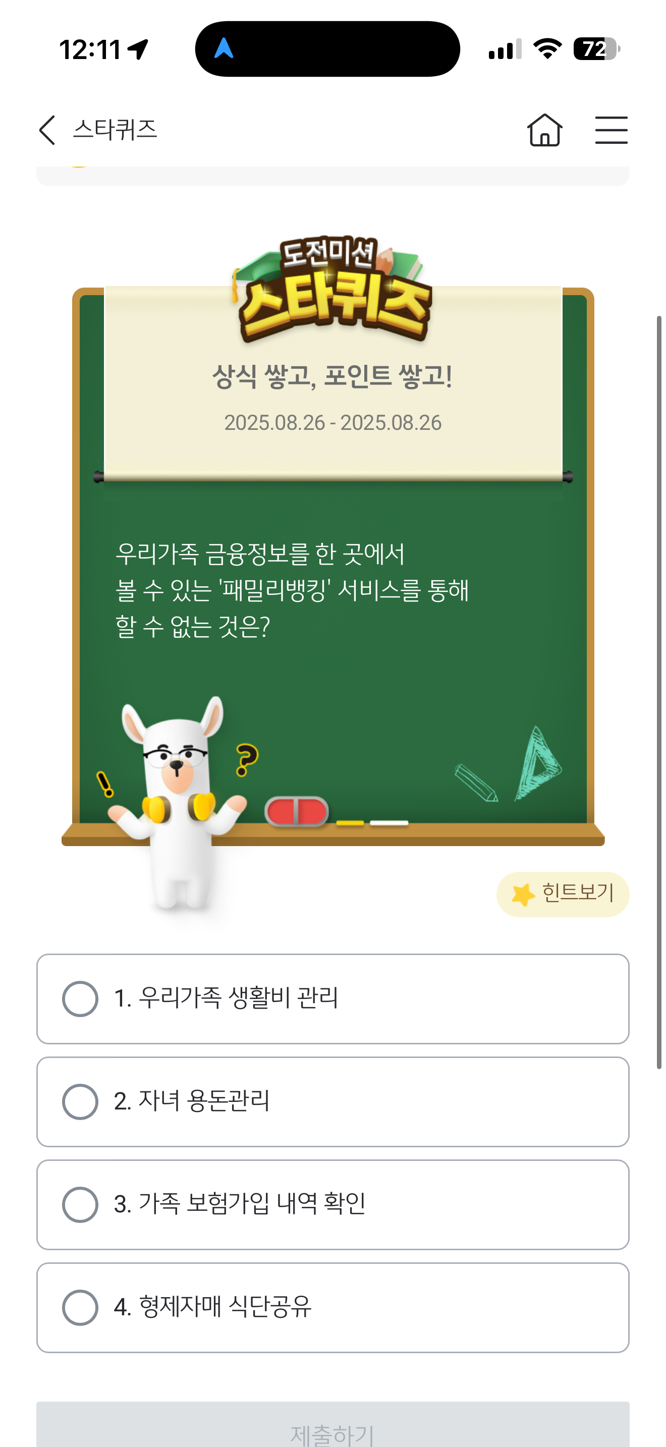 KB스타뱅킹 스타퀴즈 8월 26일 정답(우리가족 금융정보를 한 곳에서 볼 수 있는 '패밀리뱅킹' 서비스를 통해 할 수 없는 것은?)