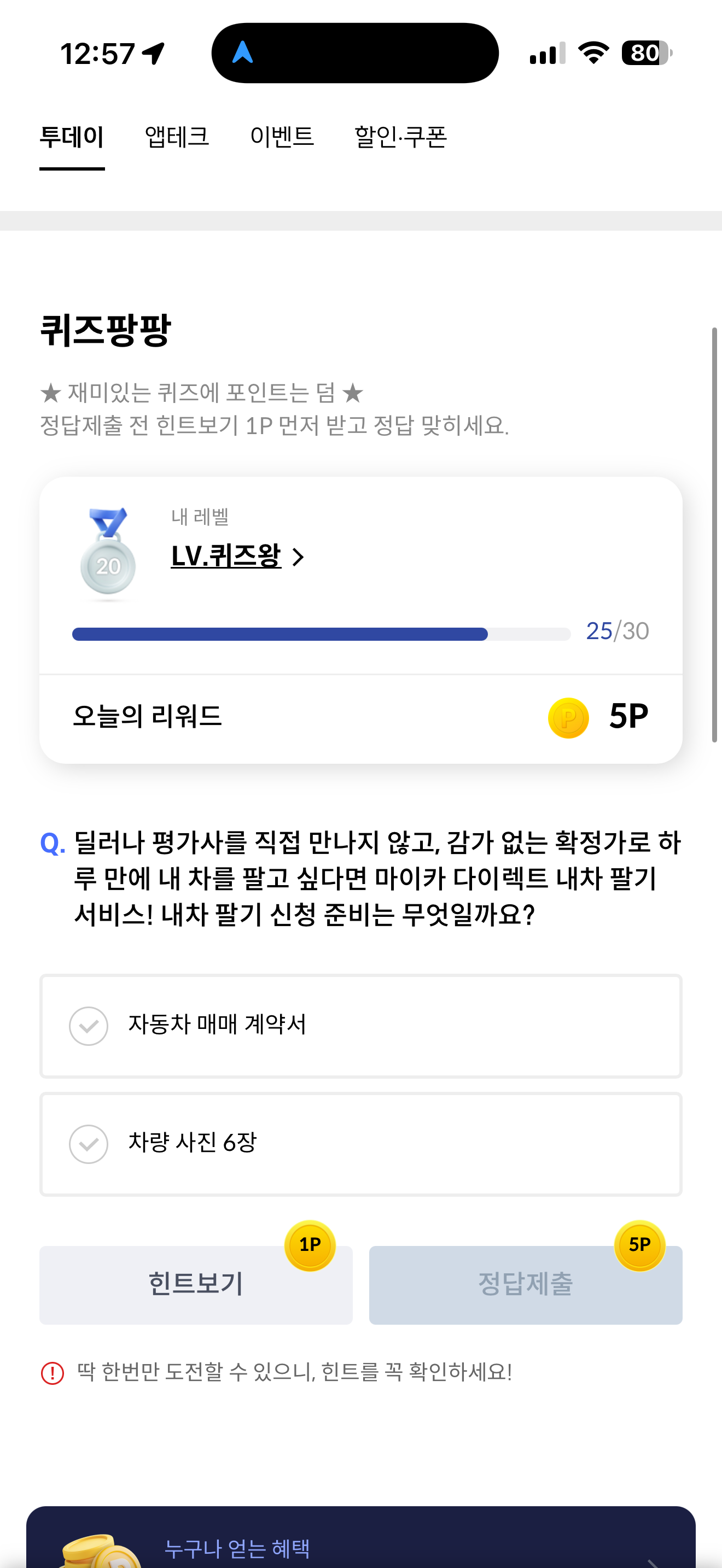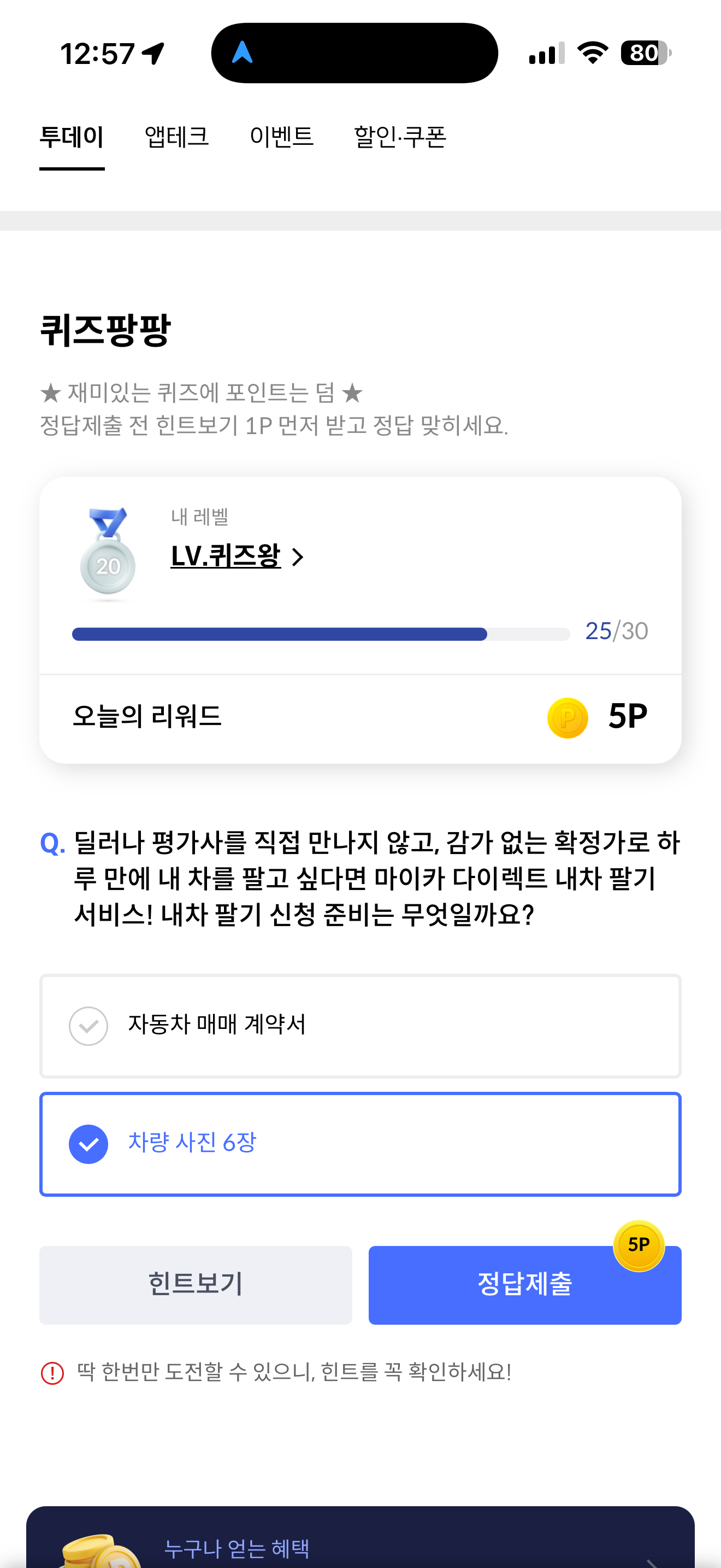 신한카드 퀴즈팡팡 8월 26일 정답(딜러나 평가사를 직접 만나지 않고, 감가 없는 확정가로 하루 만에 내 차를 팔고 싶다면 마이카 다이렉트 내차 팔기 서비스! 내차 팔기 신청 준비는 무엇일까요?)