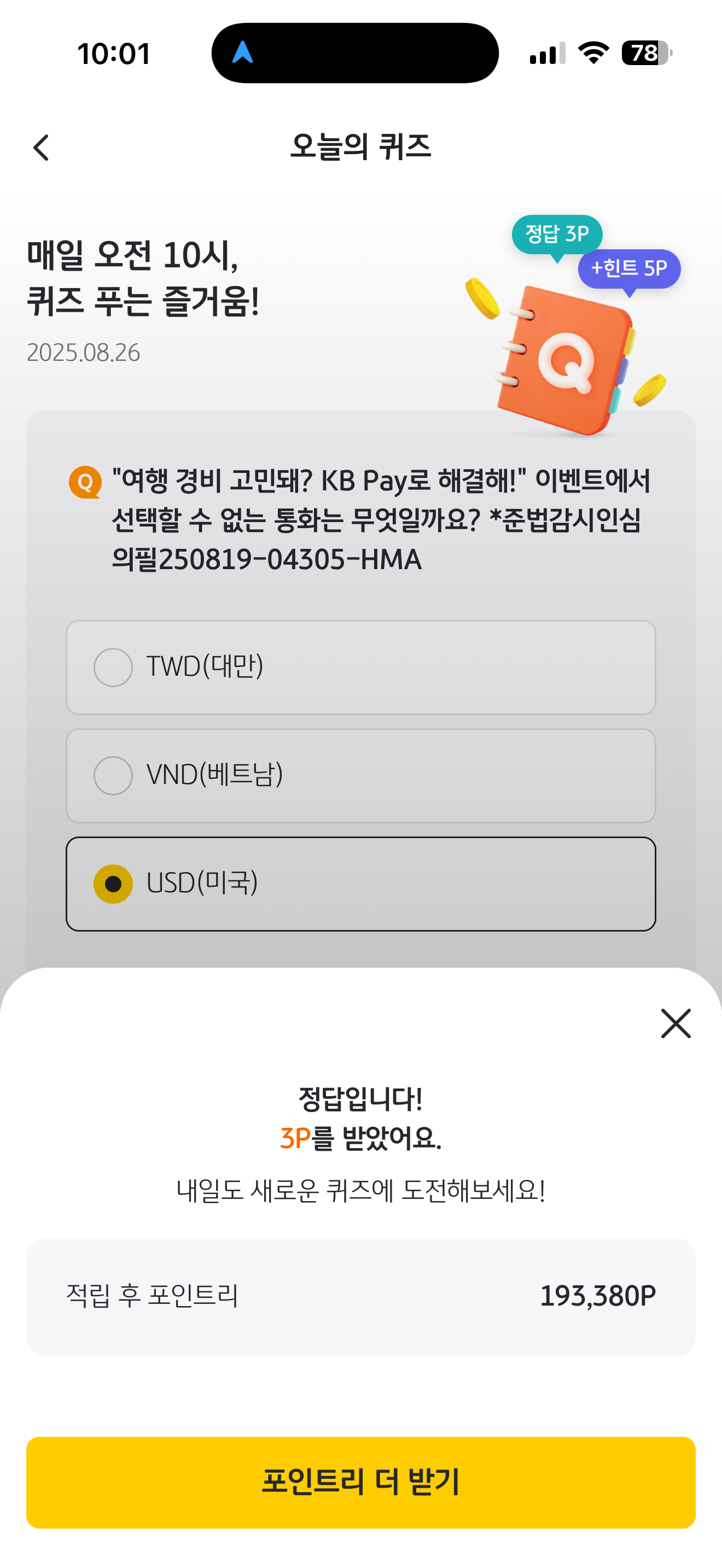 "여행 경비 고민돼? KB Pay로 해결해!" 이벤트에서 선택할 수 없는 통화는 무엇일까요? *준법감시인심의필250819-04305-HMA 보기는 1. TWD(대만) 2. VND(베트남) 3. USD(미국) 입니다.