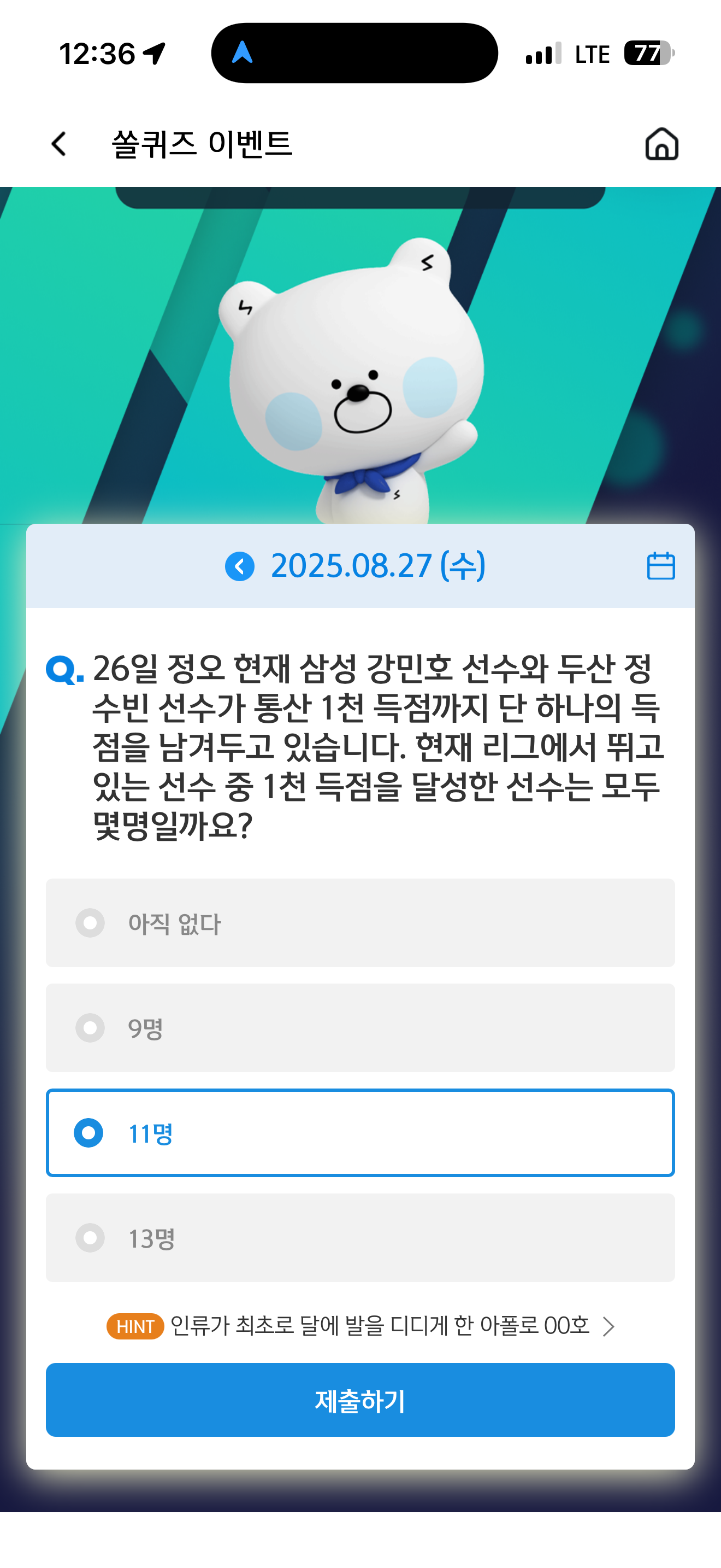 신한 슈퍼SOL 야구/상식 쏠퀴즈 정답은 11명 입니다