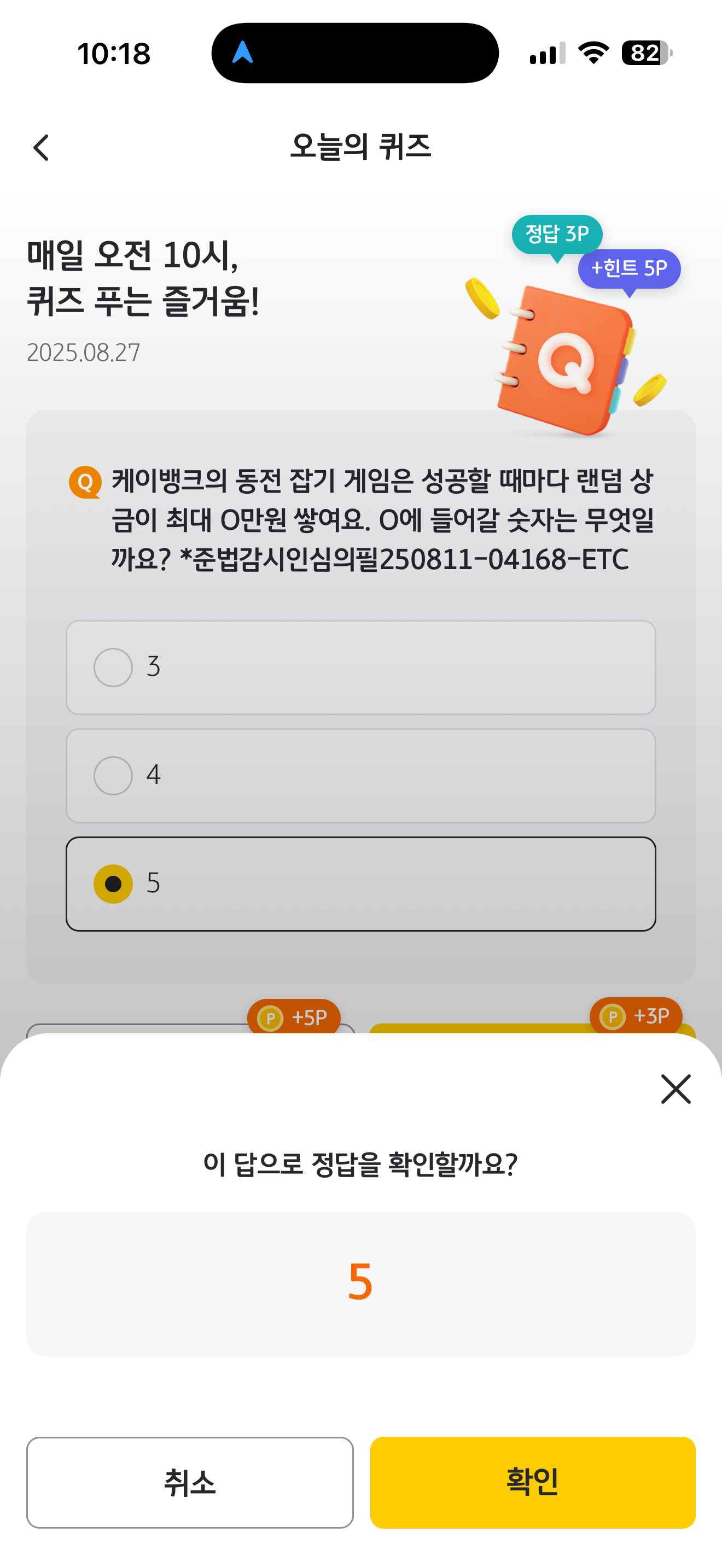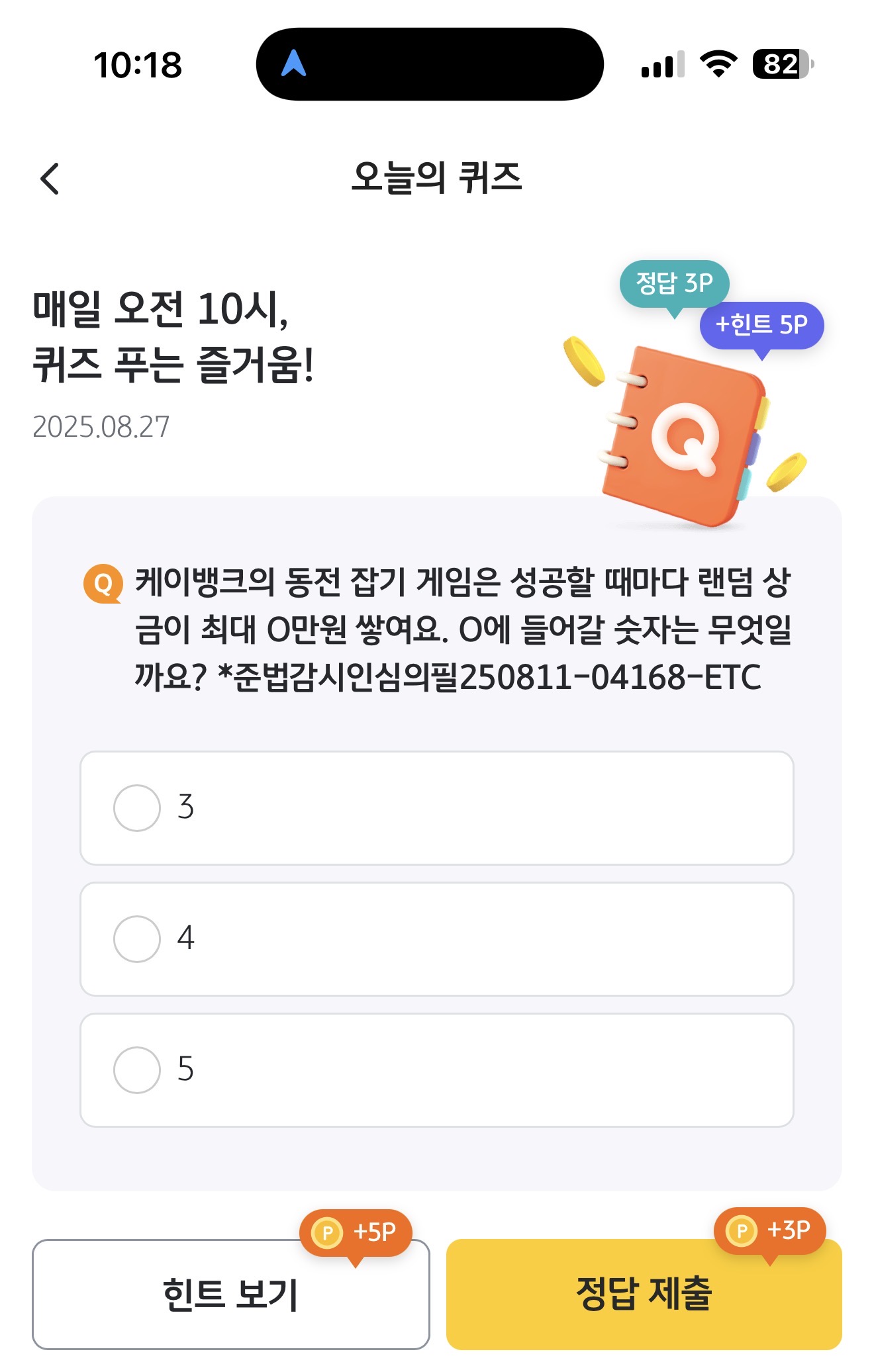 케이뱅크의 동전 잡기 게임은 성공할 때마다 랜덤 상금이 최대 O만원 쌓여요. O에 들어갈 숫자는 무엇일까요? *준법감시인심의필250811-04168-ETC 보기는 1. 3 2. 4 3. 5 입니다. 케이뱅크 아직 이용안하는 분들은 가입해 보세요. 정말 다양한 혜택이 많이 있습니다.