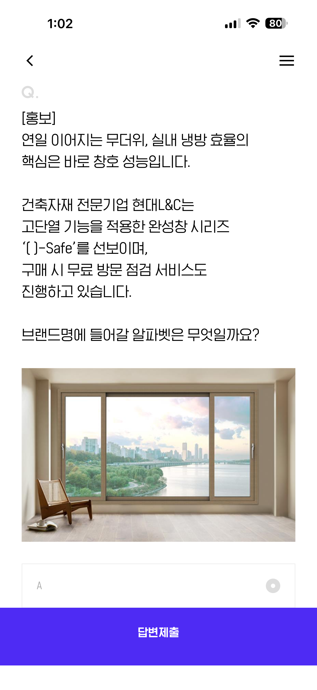 연일 이어지는 무더위, 실내 냉방 효율의 핵심은 바로 창호 성능입니다. 건축자재 전문기업 현대L&C는 고단열 기능을 적용한 완성창 시리즈 '()-Safe'를 선보이며, 구매 시 무료 방문 점검 서비스도 진행하고 있습니다. 브랜드명에 들어갈 알파벳은 무엇일까요? 보기는 1. A 2. L 3. M 4. G 입니다