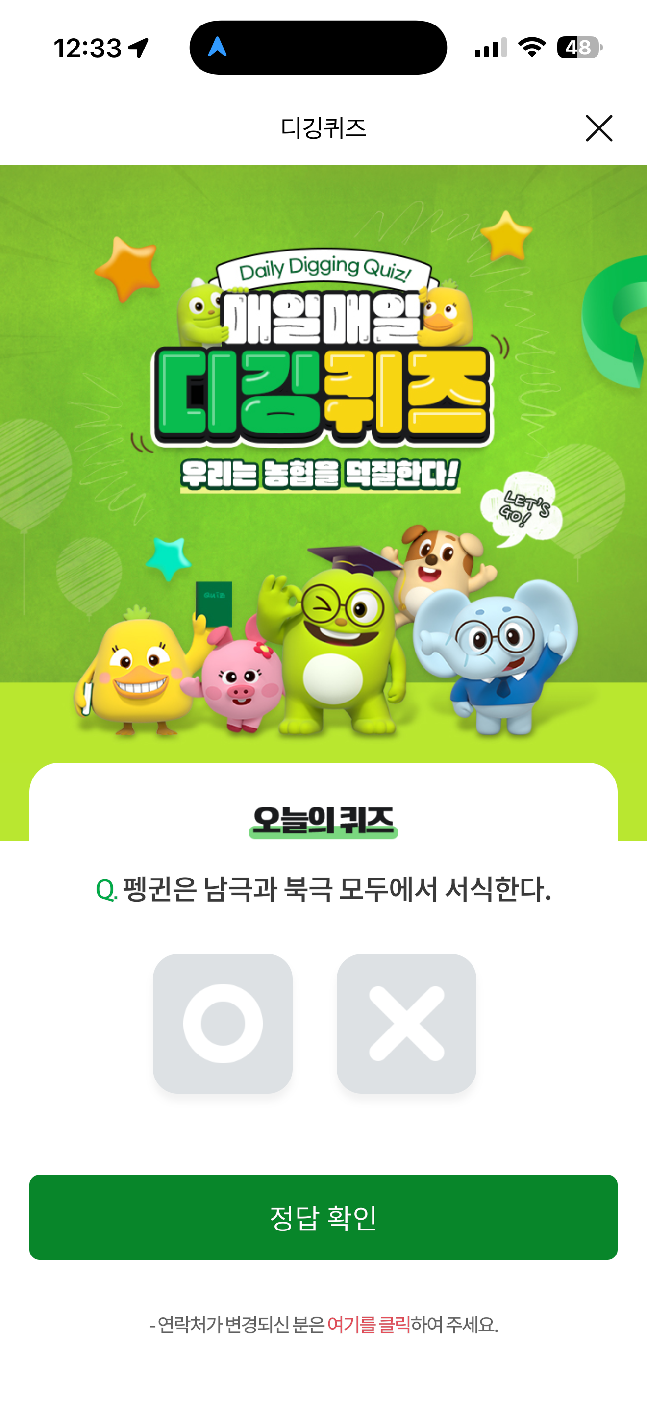NH올원뱅크 디깅퀴즈 8월 29일 정답(펭귄은 남극과 북극 모두에서 서식한다)