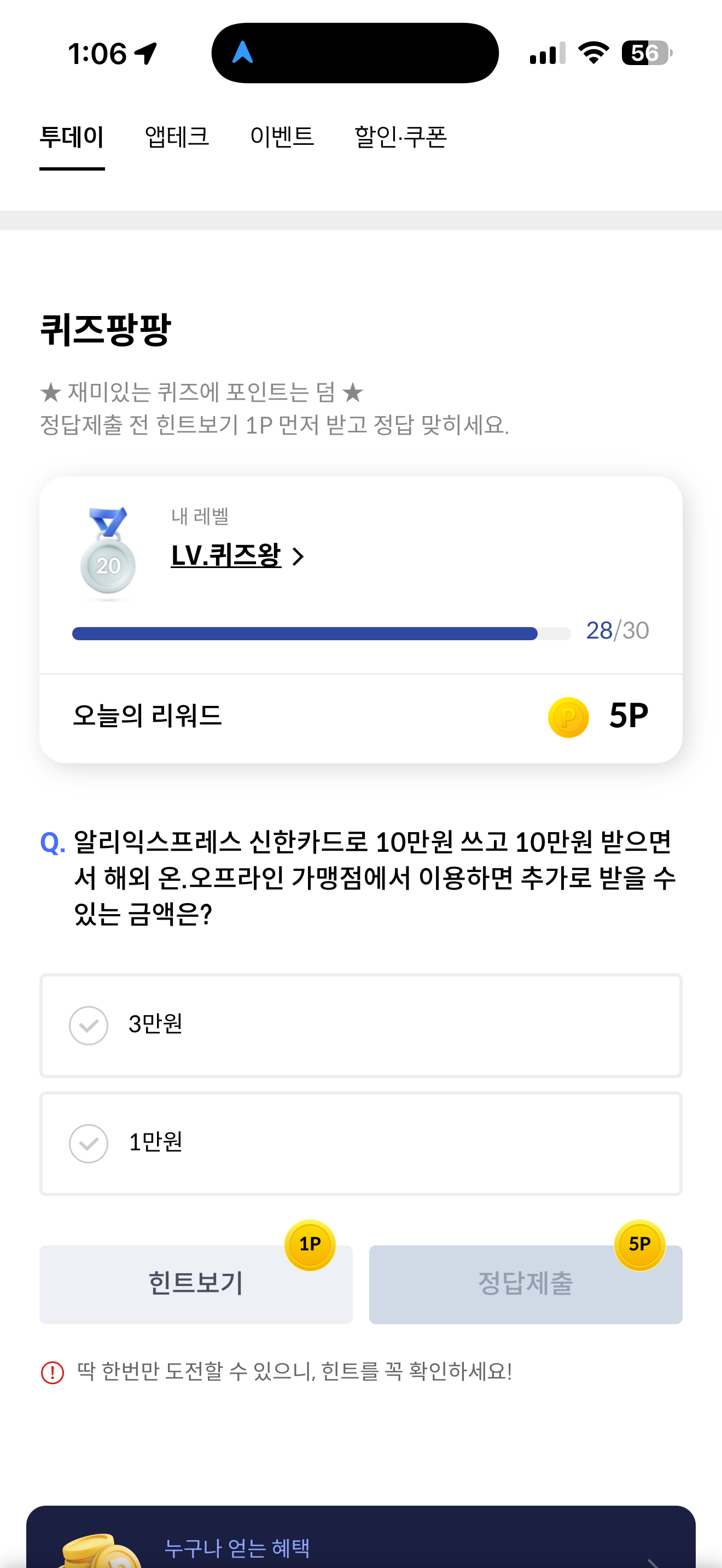 신한카드 퀴즈팡팡 정답은 3만원 입니다