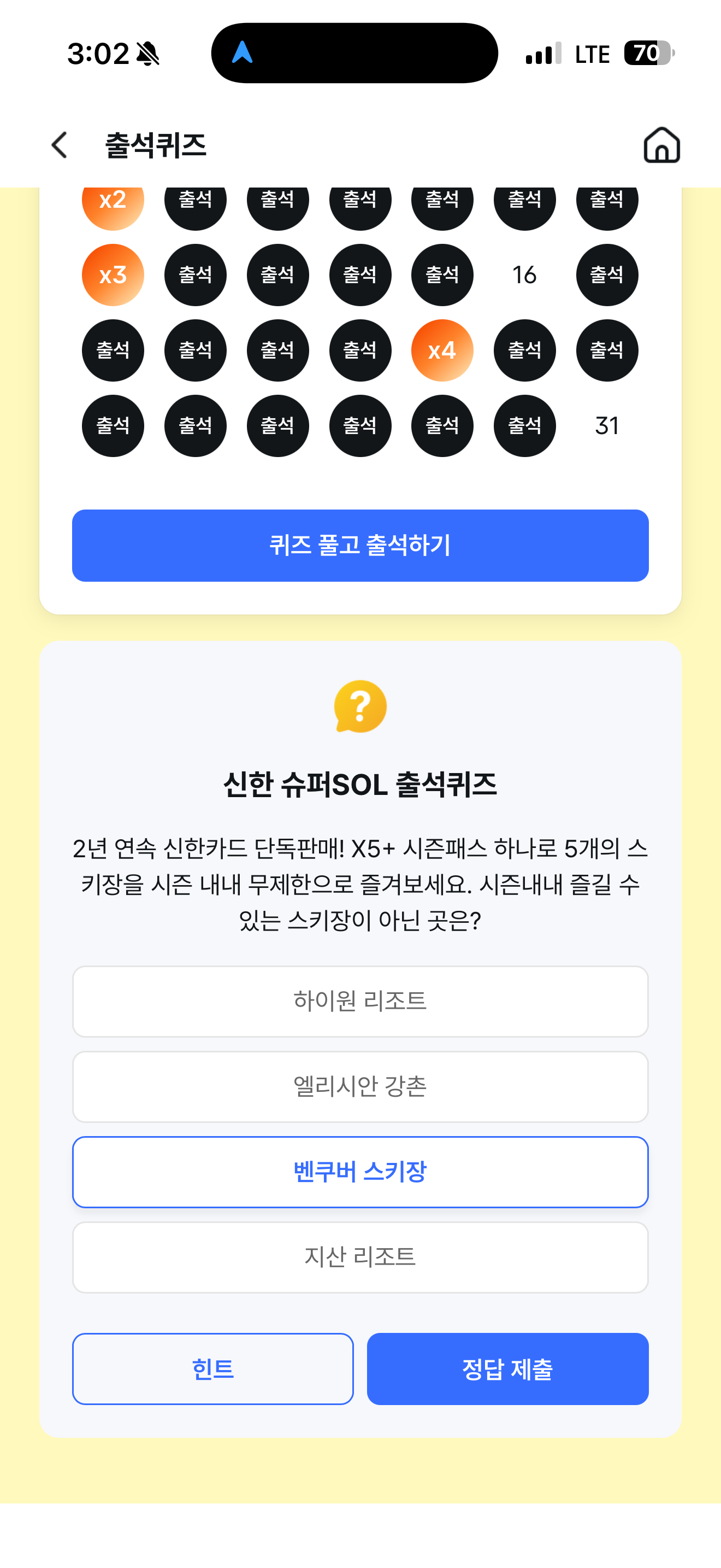 신한 슈퍼SOL 출석퀴즈 정답은 벤쿠버 스키장 입니다