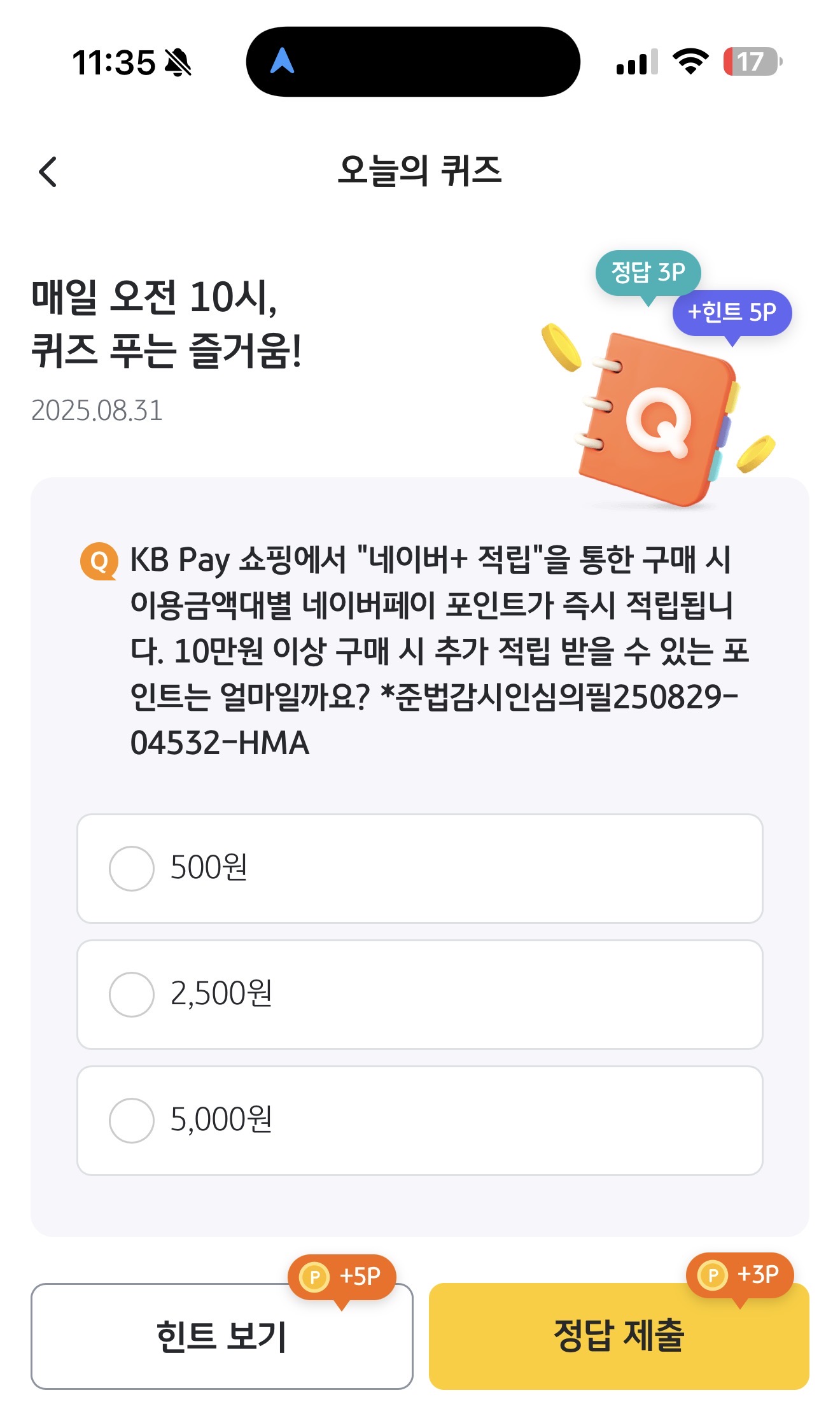 KB pay 오늘의 퀴즈 정답은 5,000원 입니다