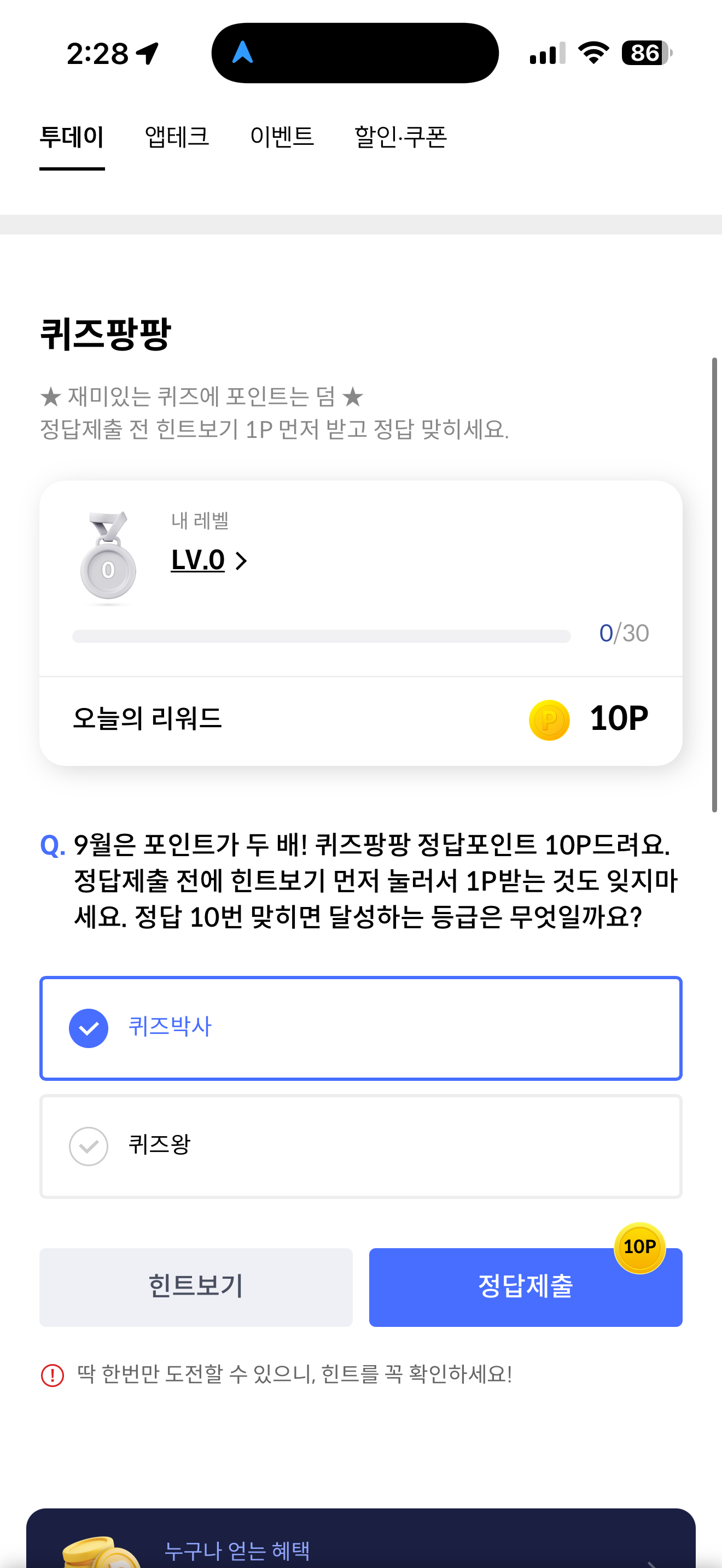 9월은 포인트가 두 배! 퀴즈팡팡 정답포인트 10P드려요. 정답제출 전에 힌트보기 먼저 눌러서 1P받는 것도 잊지마세요. 정답 10번 맞히면 달성하는 등급은 무엇일까요? 보기는 1. 퀴즈박사 2. 퀴즈왕 입니다