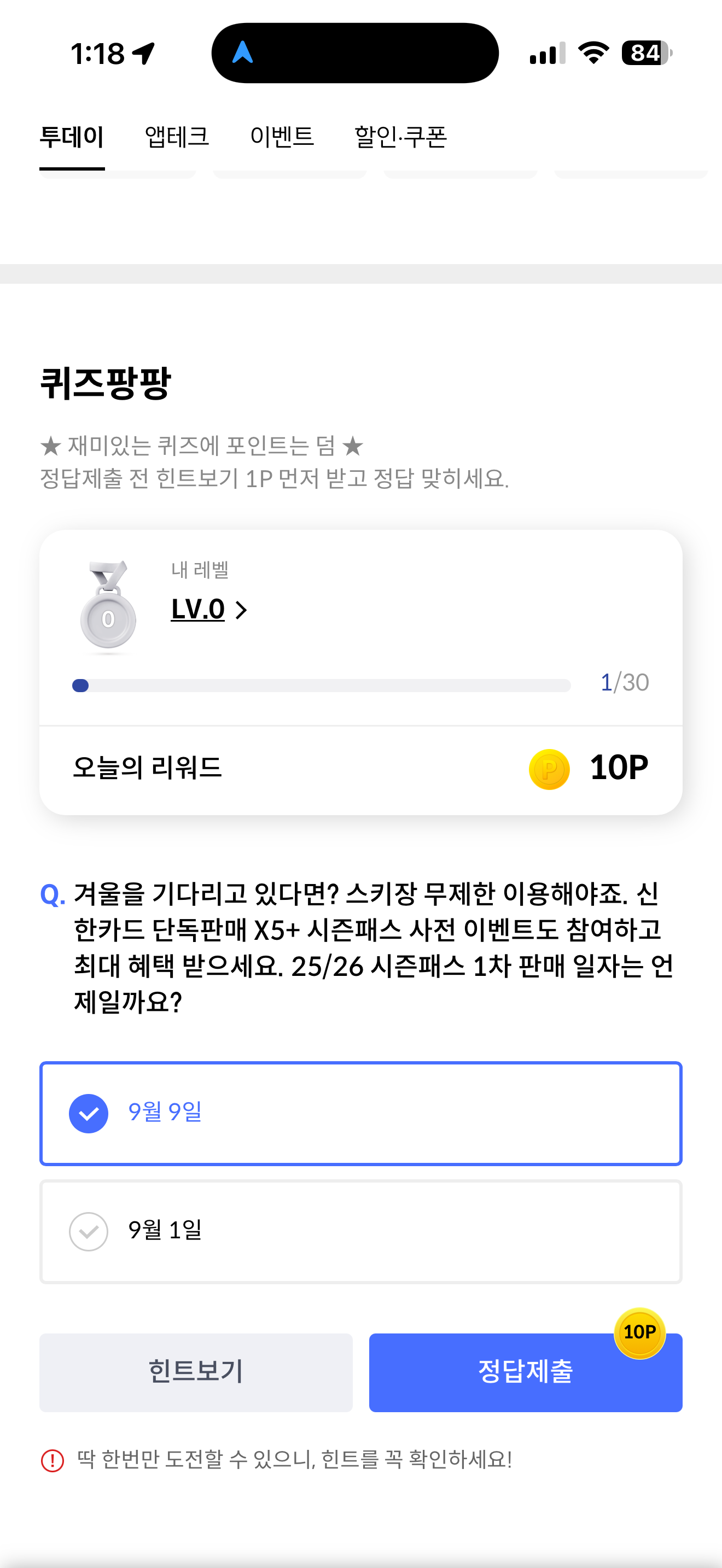 신한카드 퀴즈팡팡 정답은 9월 9일 입니다