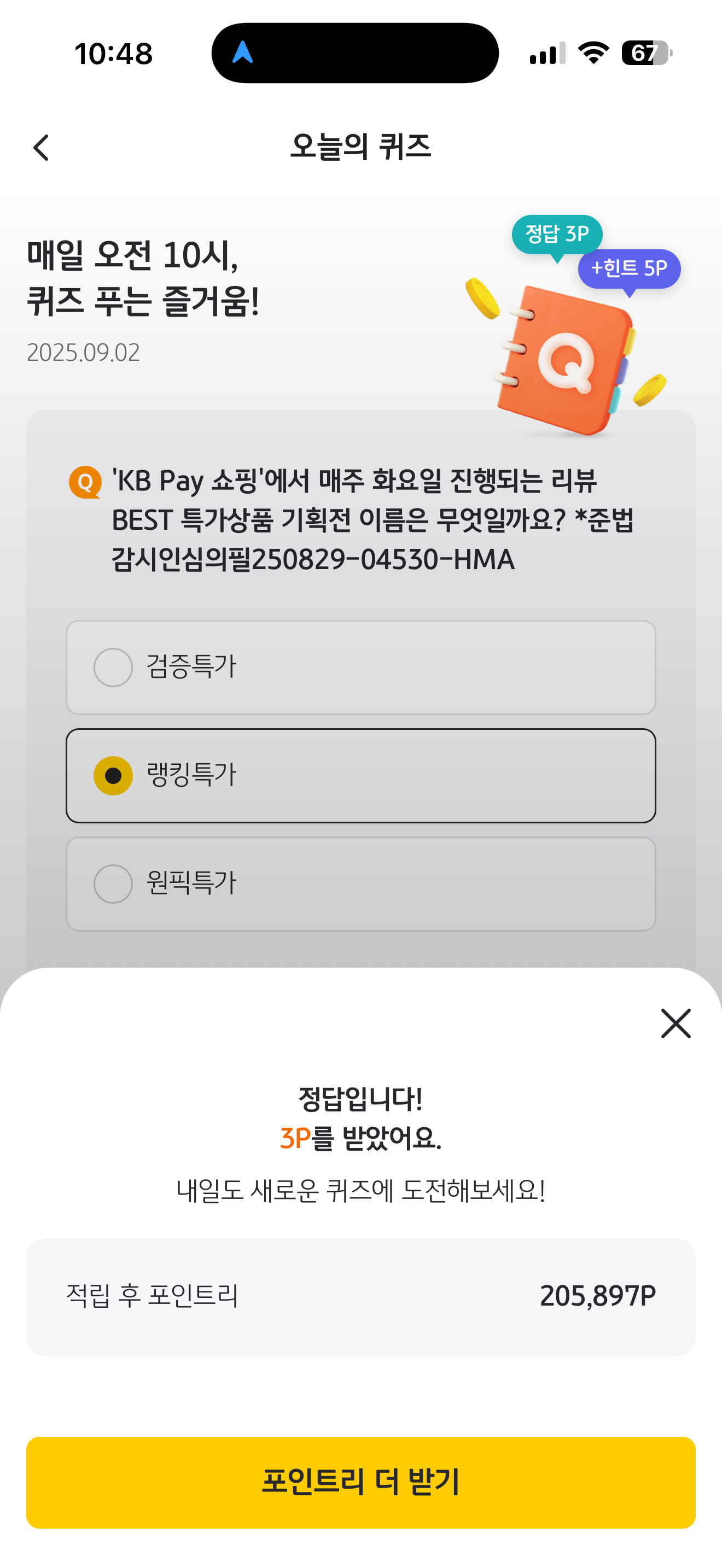 KB pay 오늘의 퀴즈 정답은 랭킹특가 입니다