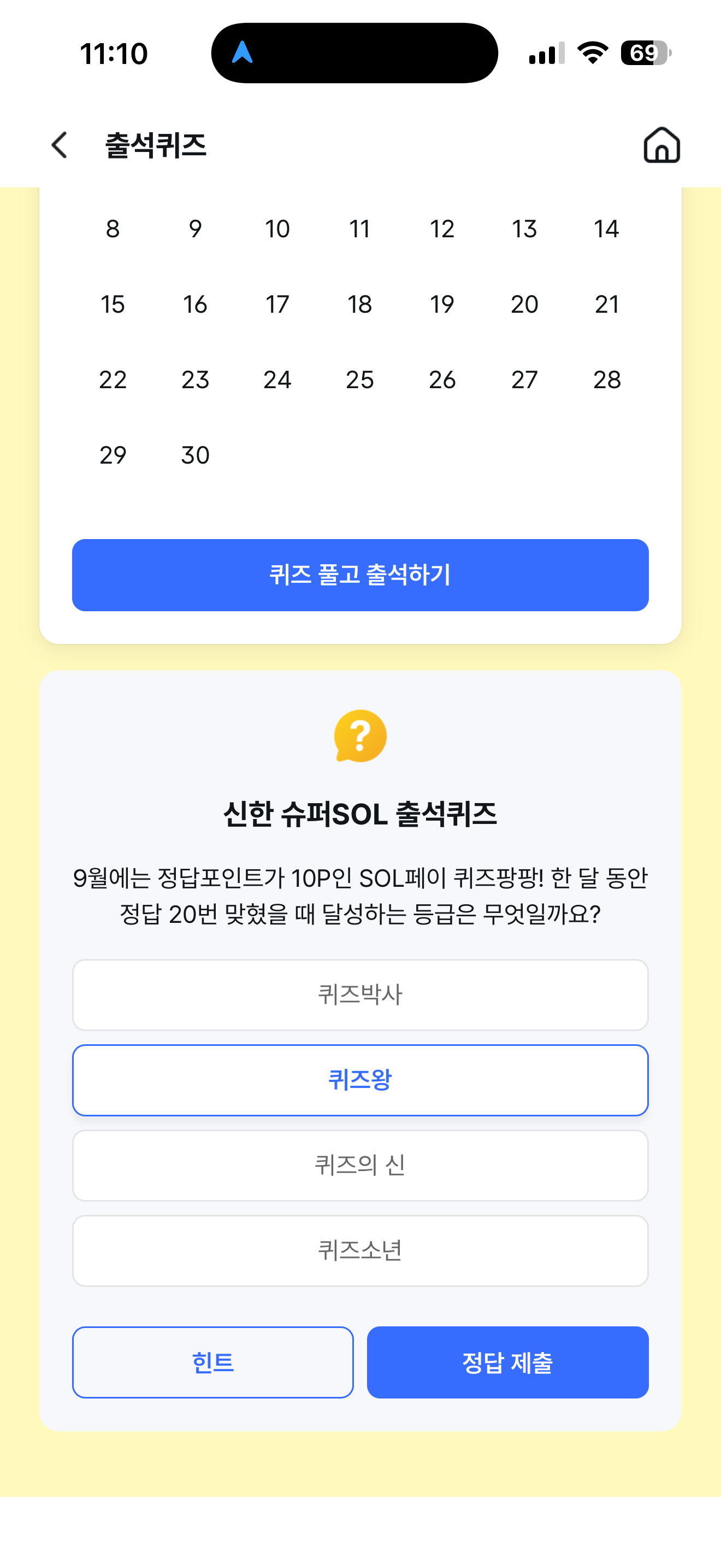 신한 슈퍼SOL 출석퀴즈 정답은 퀴즈왕 입니다