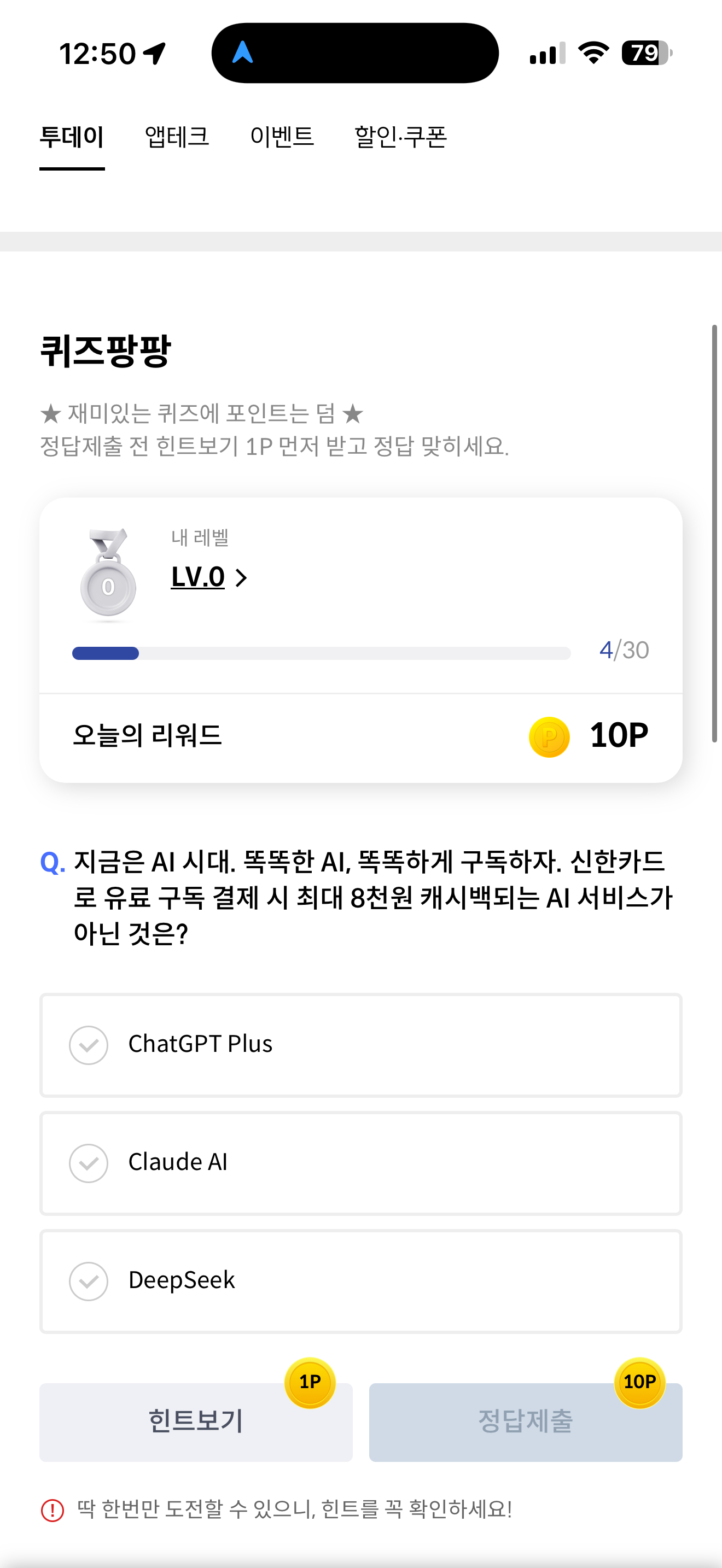 지금은 AI 시대, 똑똑한 AI, 똑똑하게 구독하자. 신한카드로 유료 구독 결제 시 최대 8천원 캐시백되는 AI 서비스가 아닌 것은? 보기는 1. ChatGPT Plus 2. Claude AI 3. DeepSeek 입니다