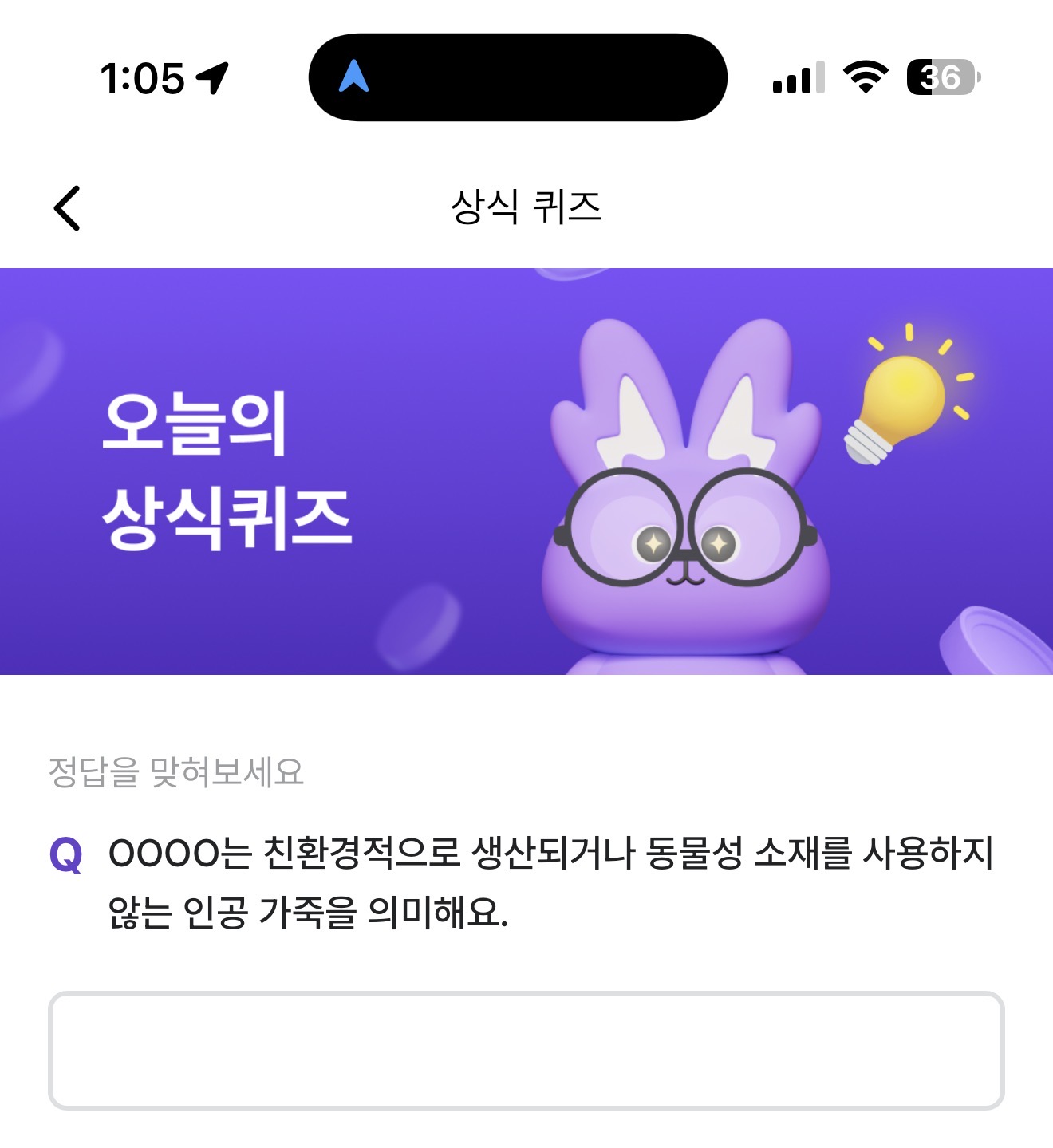 OOOO는 친환경적으로 생산되거나 동물성 소재를 사용하지 않는 인공 가죽을 의미해요. 주관식 퀴즈인데요. 친환경을 위해 다양한 노력들이 이뤄지고 있습니다. 예전에는 동물성 가죽이 고급 제품에는 많이 사용되었는데 요즘은 이를 대체하기 위한 노력을 하고 있습니다.