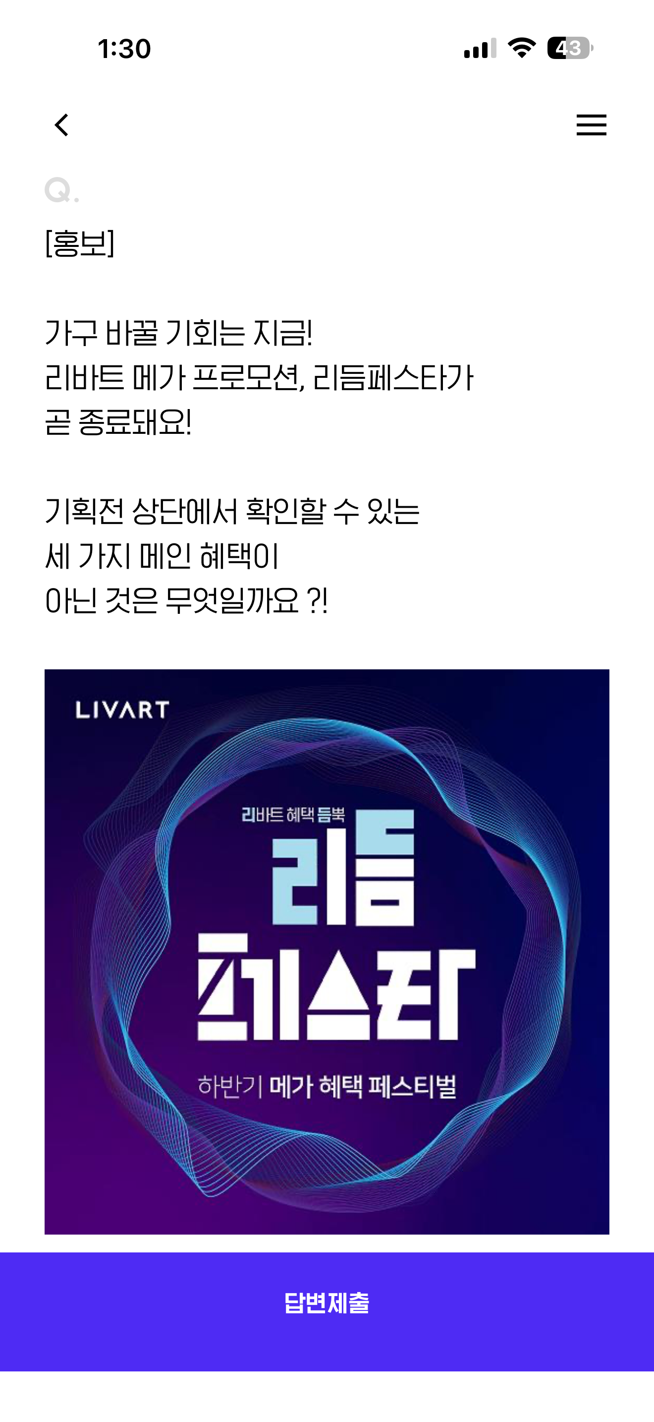가구 바꿀 기회는 지금! 리바트 메가 프로모션, 리듬페스타가 곧 종료돼요! 기획전 상단에서 확인할 수 있는 세 가지 메인 혜택이 아닌 것은 무엇일까요? 보기는 1. 최대 150만원 할인, 리듬팩 2. 신규 인기 상품! 신인상 3. 무료 배송, 무료 반품 4. 믿고 구매할 수 있는 3종 케어팩 입니다