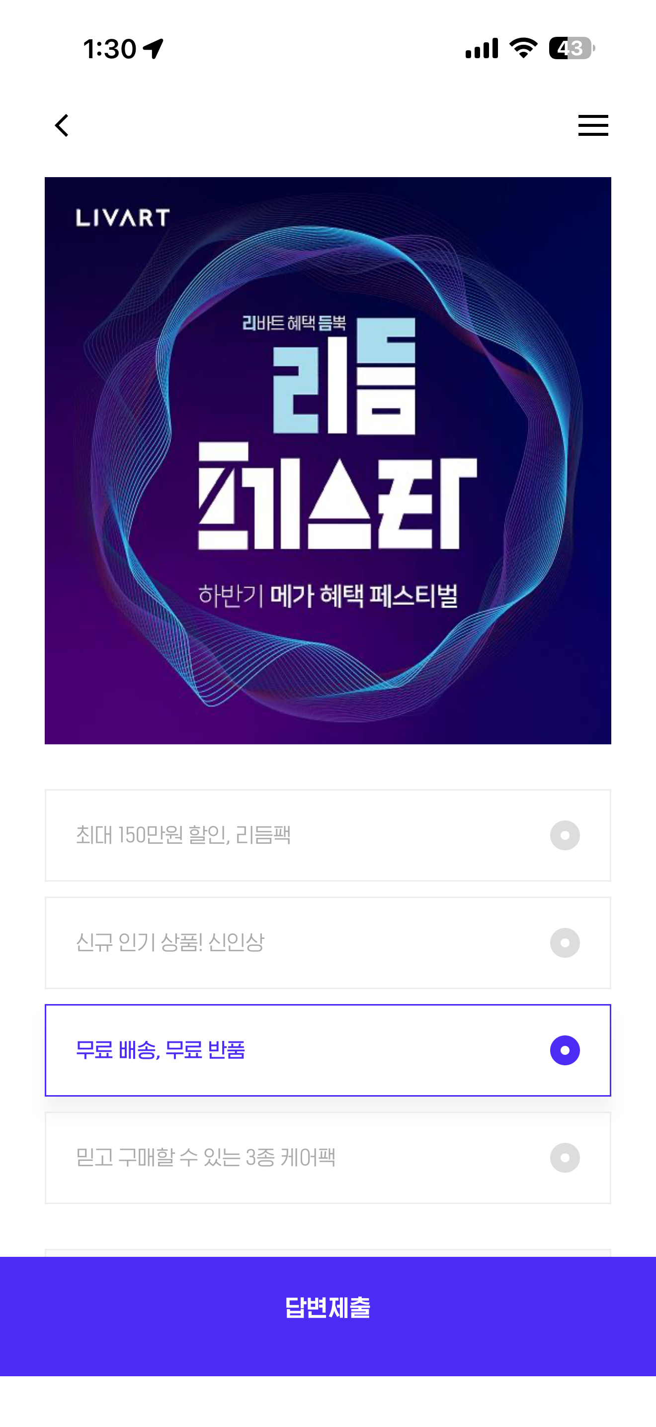 가구 바꿀 기회는 지금! 리바트 메가 프로모션, 리듬페스타가 곧 종료돼요! 기획전 상단에서 확인할 수 있는 세 가지 메인 혜택이 아닌 것은 무엇일까요? 보기는 1. 최대 150만원 할인, 리듬팩 2. 신규 인기 상품! 신인상 3. 무료 배송, 무료 반품 4. 믿고 구매할 수 있는 3종 케어팩 입니다