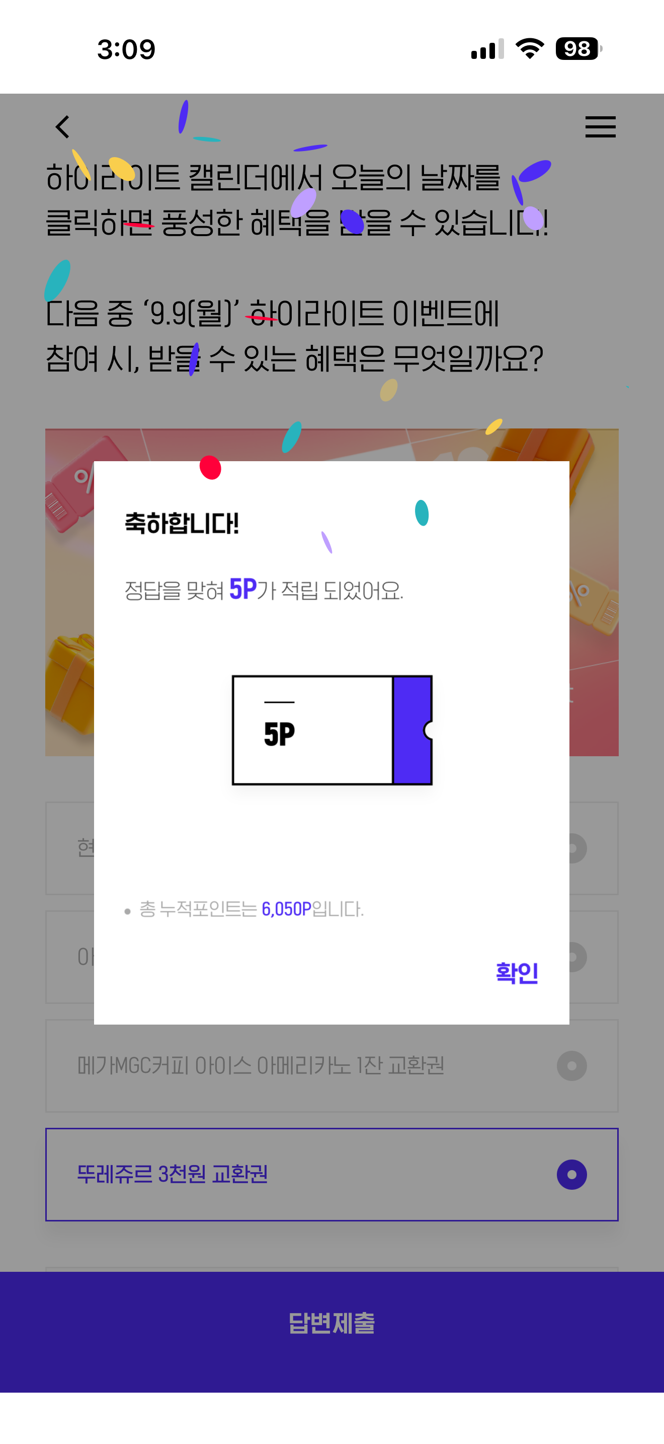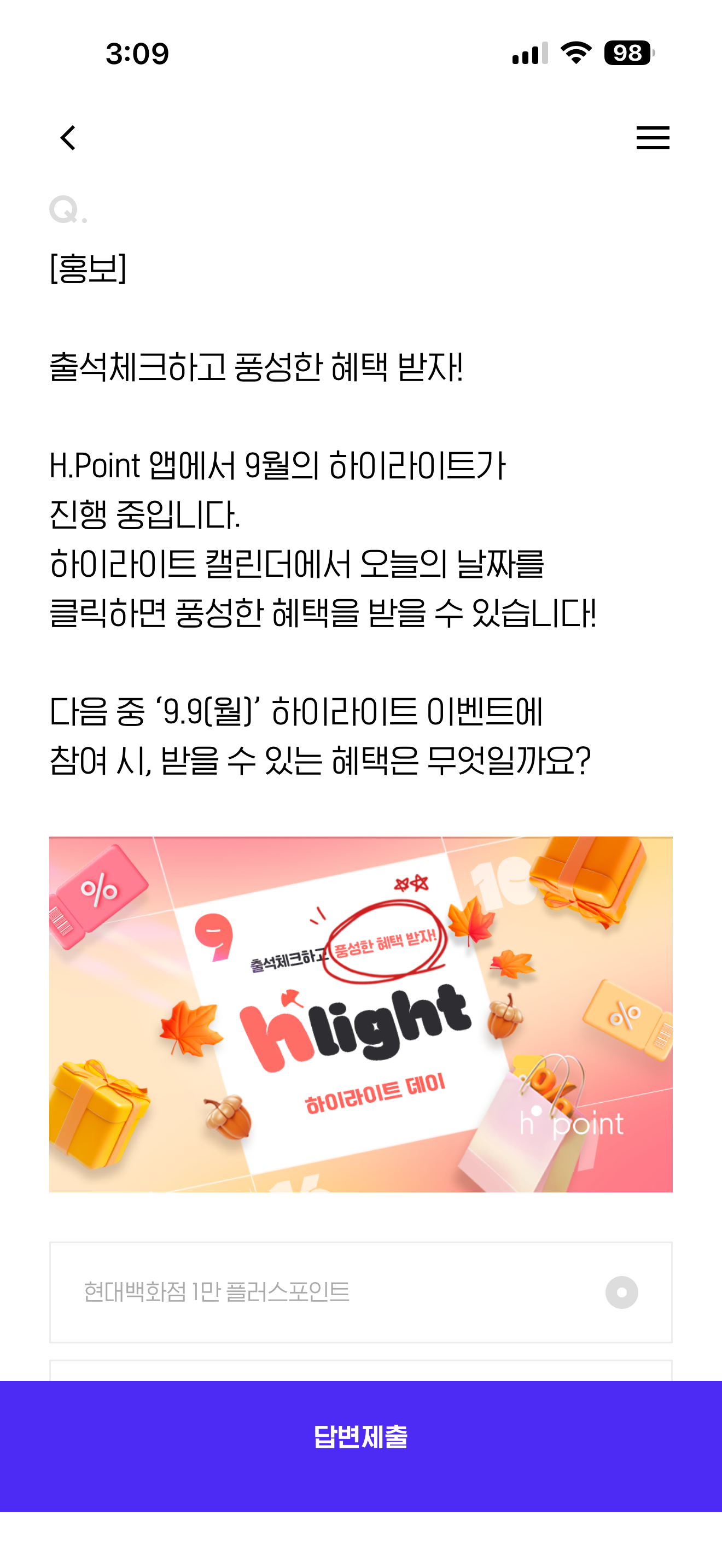 출석체크하고 풍성한 혜택 받자! H.Point 앱에서 9월의 하이라이트가 진행 중입니다. 하이라이트 캘린더에서 오늘의 날짜를 클릭하면 풍성한 혜택을 받을 수 있습니다! 다음 중 '9.9(월)' 하이라이트 이벤트에 참여 시, 받을 수 있는 혜택은 무엇일까요? 보기는 1. 현대백화점 1만 플러스포인트 2. 아모레퍼시픽 뷰티 포인트 쿠폰 3. 메가MGC커피 아이스 아메리카노 1잔 교환권 4. 뚜레쥬르 3천원 교환권 입니다