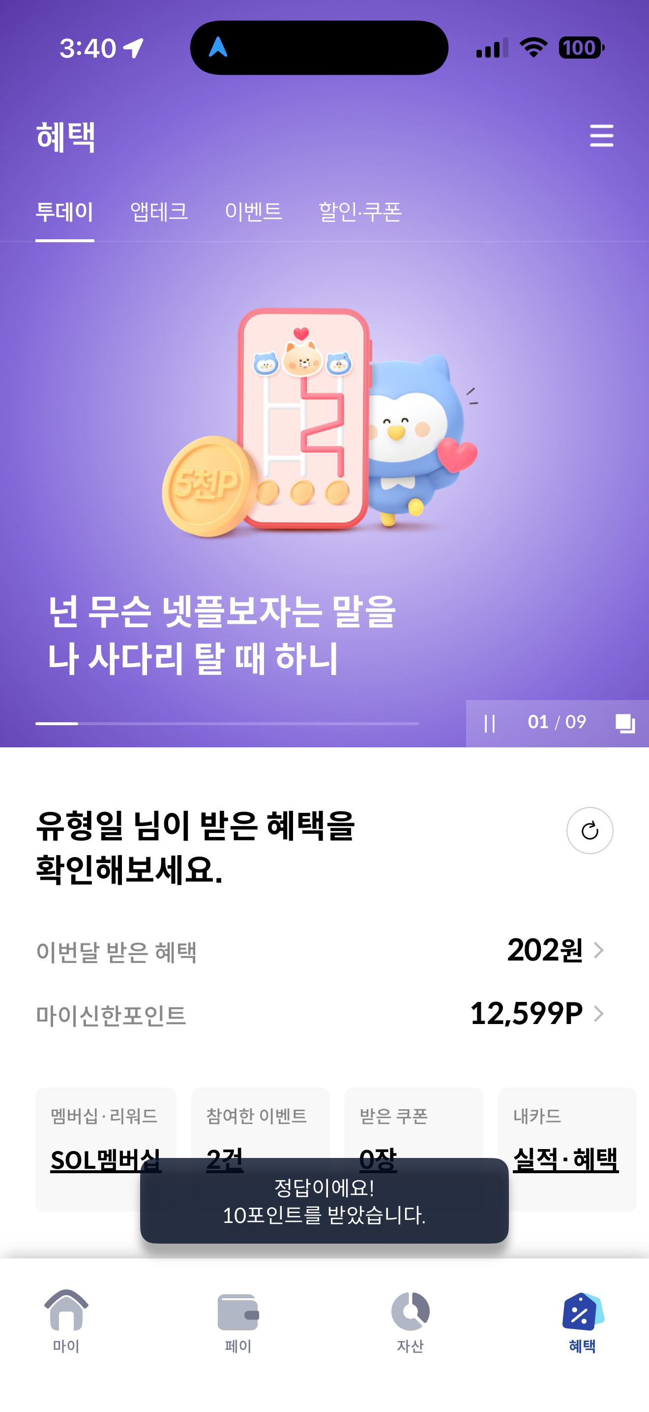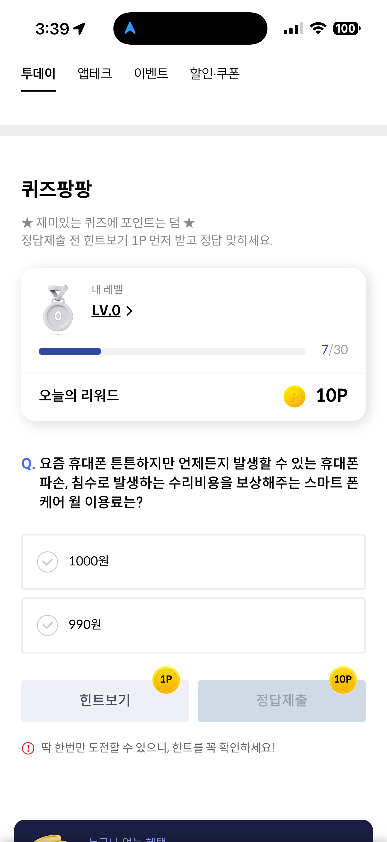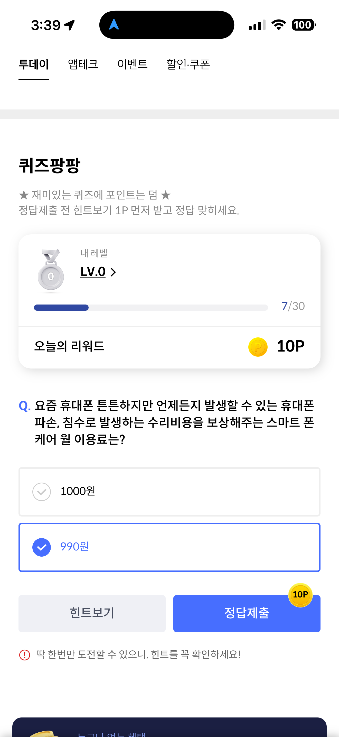 신한카드 퀴즈팡팡 정답은 990원 입니다