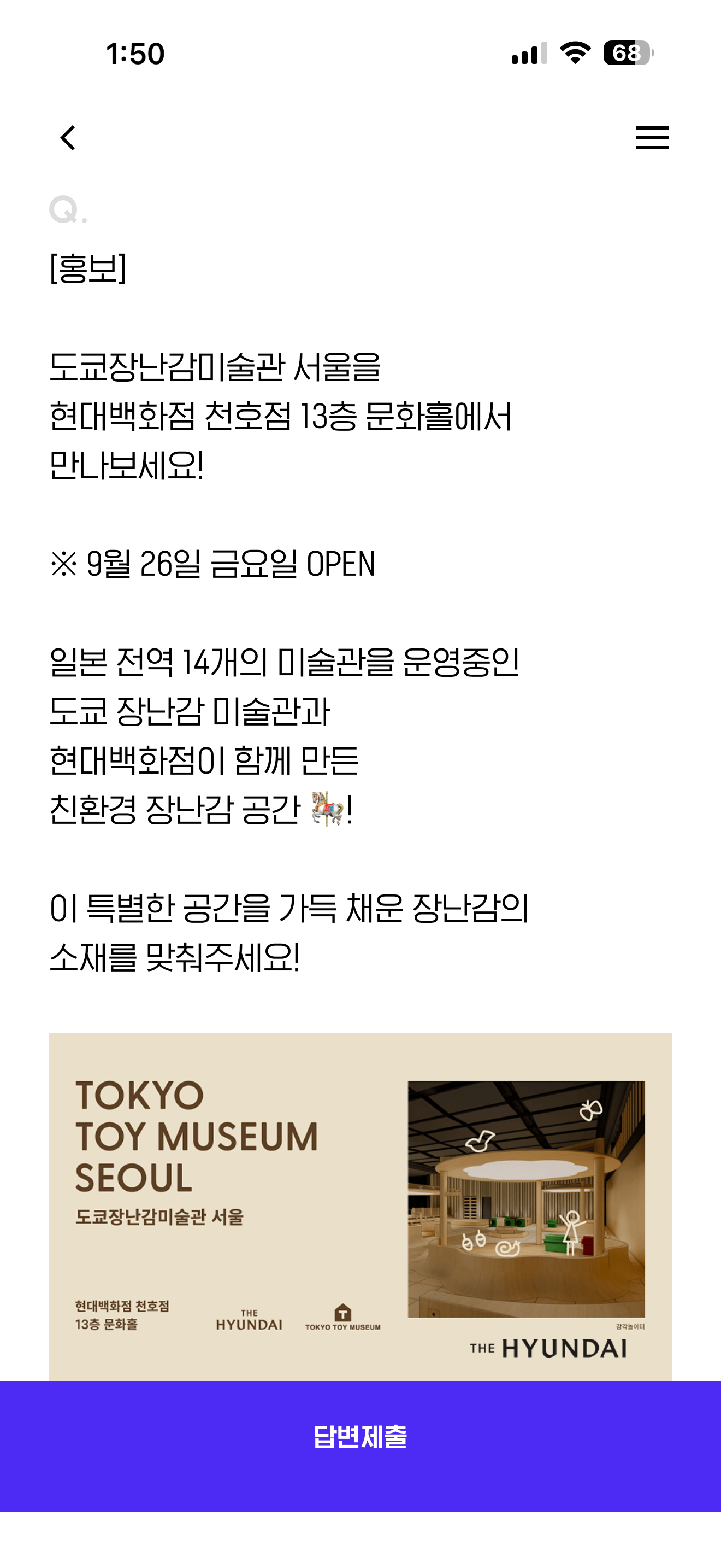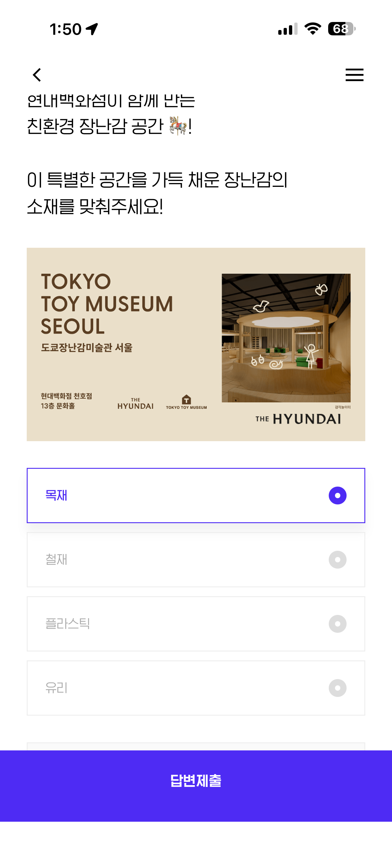 도쿄장난감미술관 서울을 현대백화점 천호점 13층 문화홀에서 만나보세요! 9월 26일 금요일 OPEN 일본 전역 14개의 미술관을 운영중인 도쿄 장난감 미술관과 현대백화점이 함께 만든 친환경 장난감 공간! 이 특별한 공간을 가득 채운 장난감의 소재를 맞춰주세요! 보기는 1. 목재 2. 철재 3. 플라스틱 4. 유리 입니다