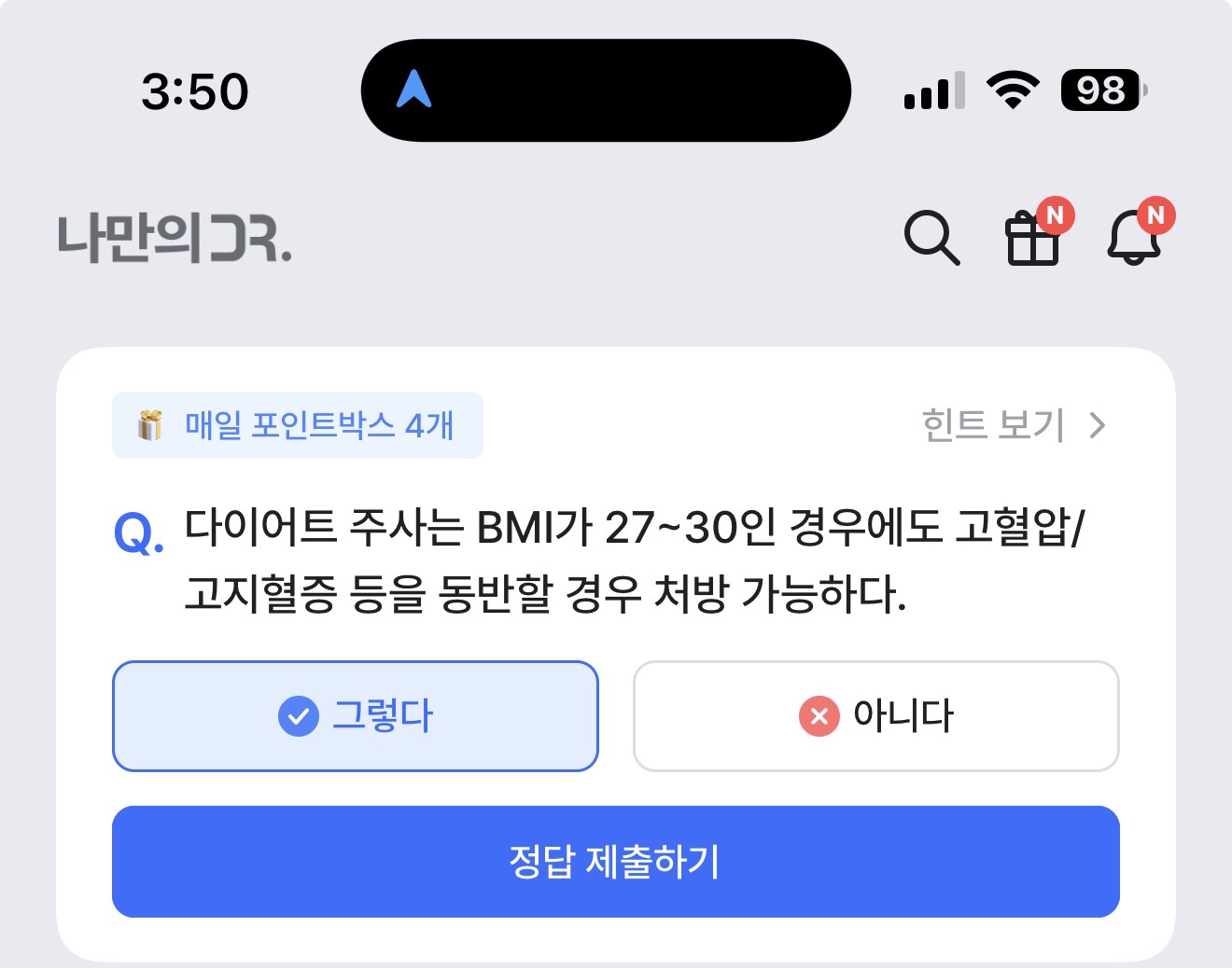 나만의 닥터 퀴즈 9월 9일 정답(다이어트 주사는 BMI가 27~30인 경우에도 고혈압/고지혈증 등을 동반할 경우 처방 가능하다)