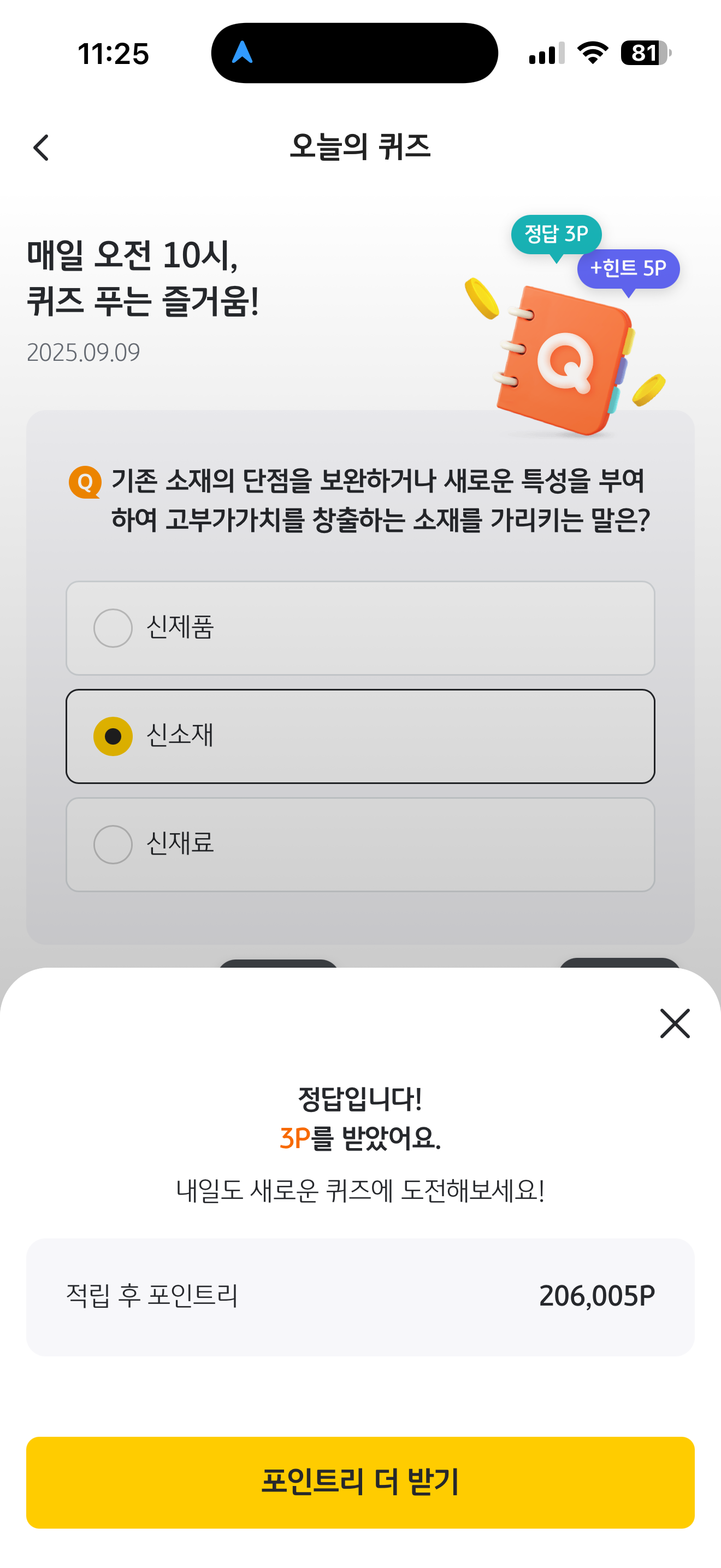 KB pay 오늘의 퀴즈 정답은 신소재 입니다