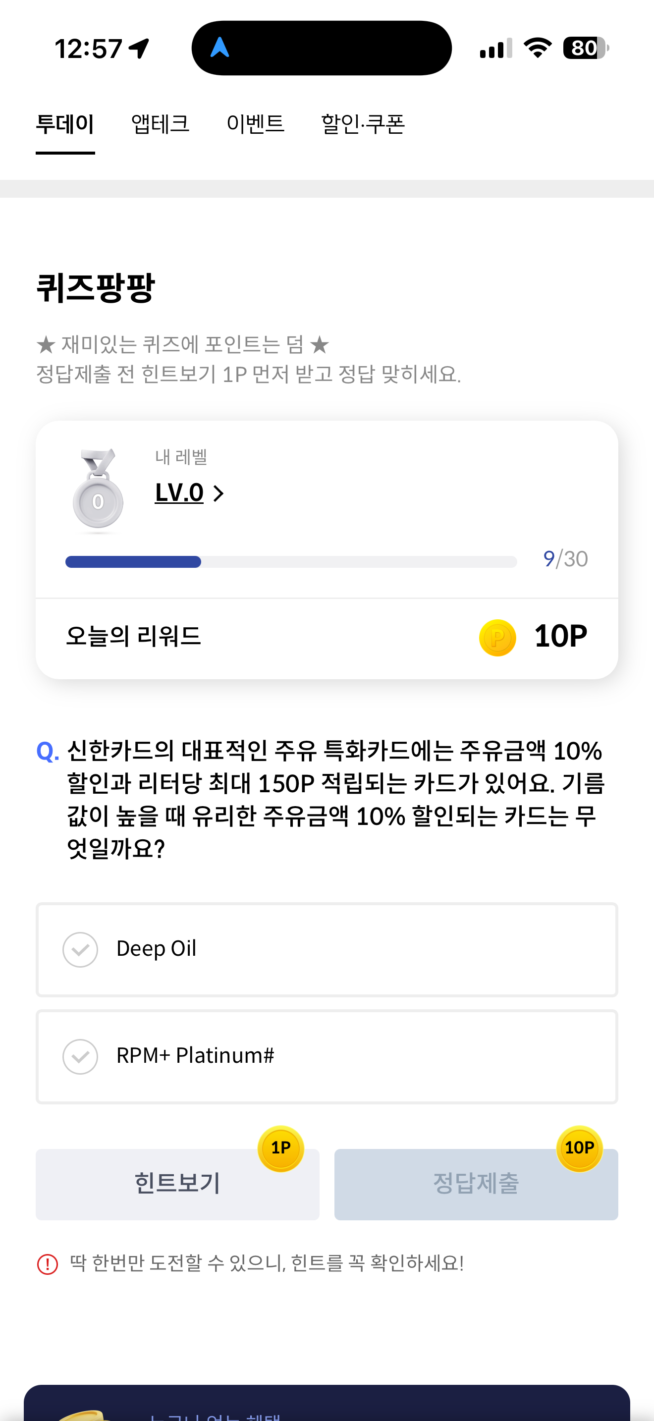 신한카드 퀴즈팡팡 정답은 Deep Oil 입니다