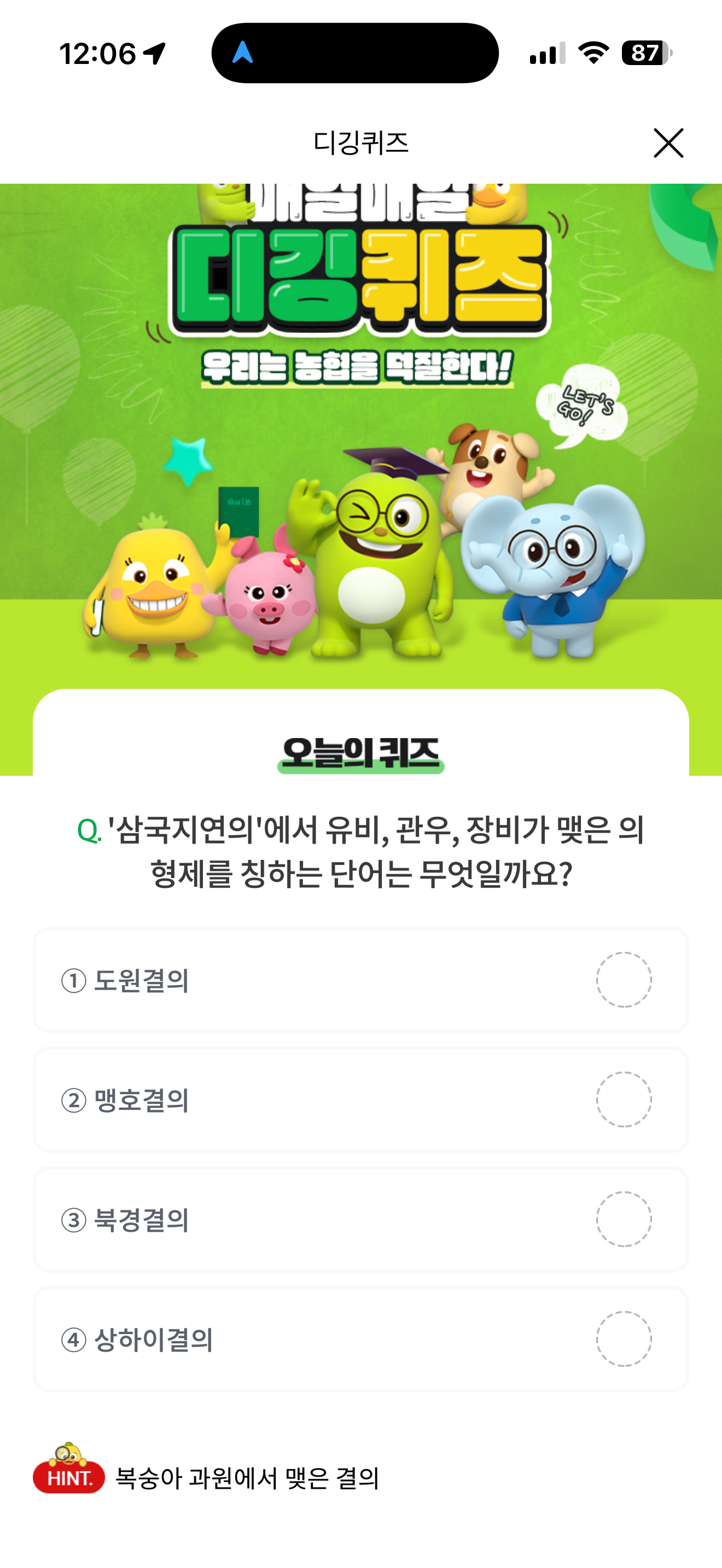 NH올원뱅크 디깅퀴즈 9월 11일 정답('삼국지연의'에서 유비, 관우, 장비가 맺은 의형제를 칭하는 단어는 무엇일까요?)