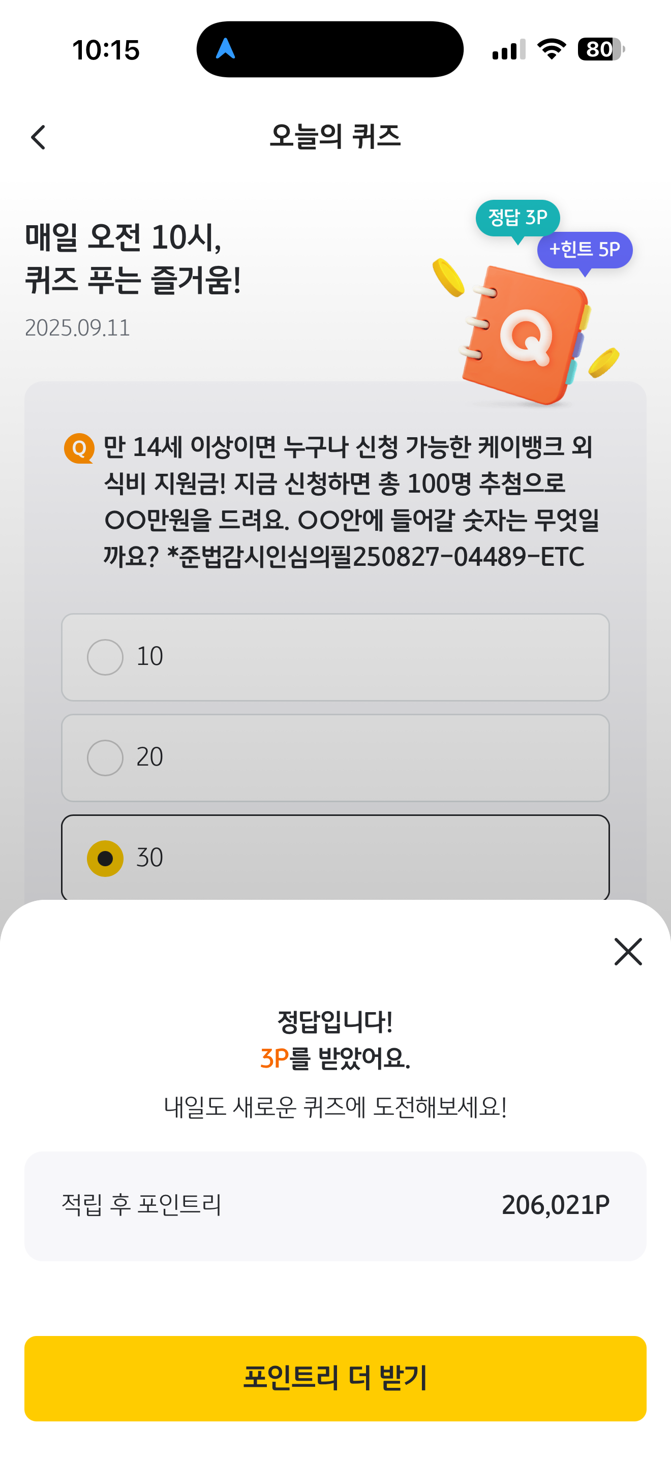 KB Pay 오늘의 퀴즈 정답은 30 입니다